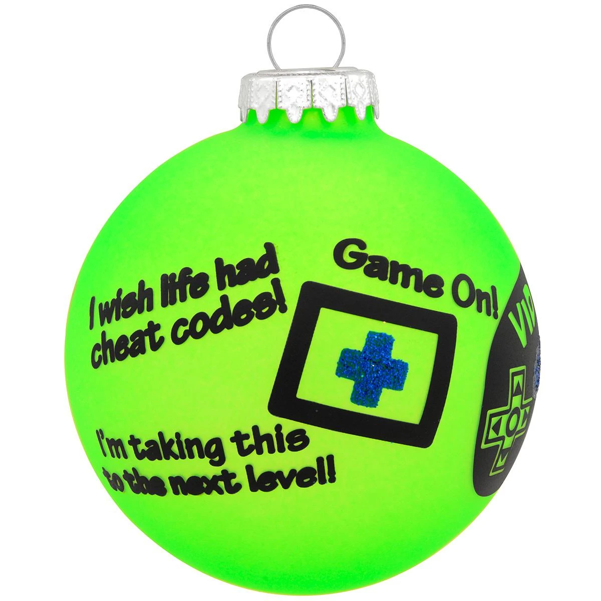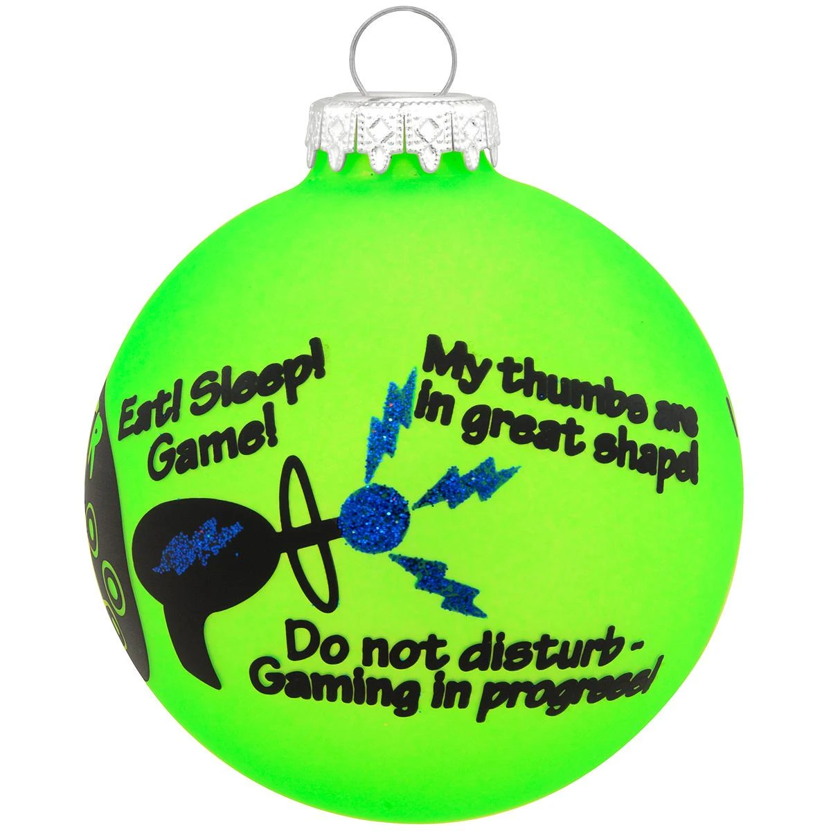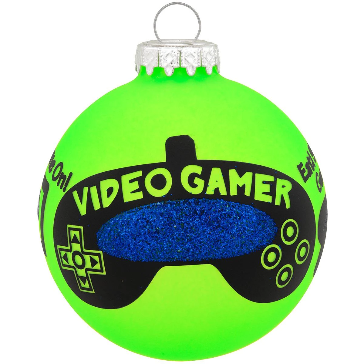 Take your Christmas shopping to the next level and surprise your video gamer with a gift that is sure to score extra points! Exclusively crafted for Bronner’s from Hungary, this 3″ neon green video gamer glass ornament features several tongue-in-cheek phrases as well as the title Video Gamer printed in black. Phrases include: