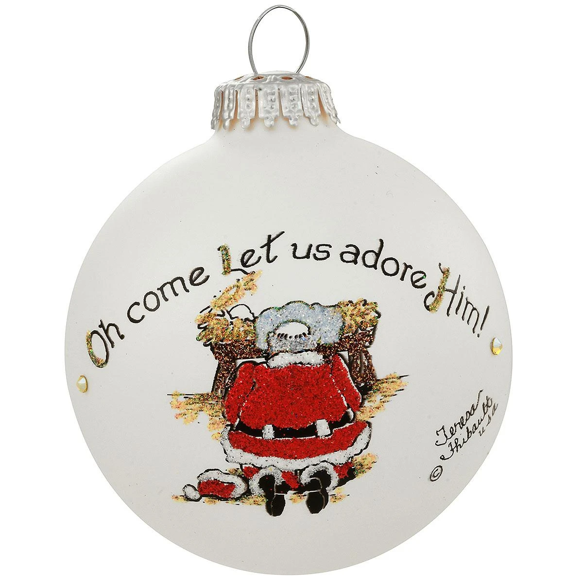 Santa is depicted kneeling before the manger of the Christ child imploring all with the message: Oh come Let us adore Him! Handcrafted of glass in the USA, this meaningful Heart Gifts ornament by Teresa Thibault shimmers with inspired brushstrokes, colorful glitter, and a sprinkling of dazzling Swarovski crystals. 3ΒΌ” keepsake comes attractively packaged for safe storage and easy gift giving and makes a great gift for everyone on your CHRISTmas list!