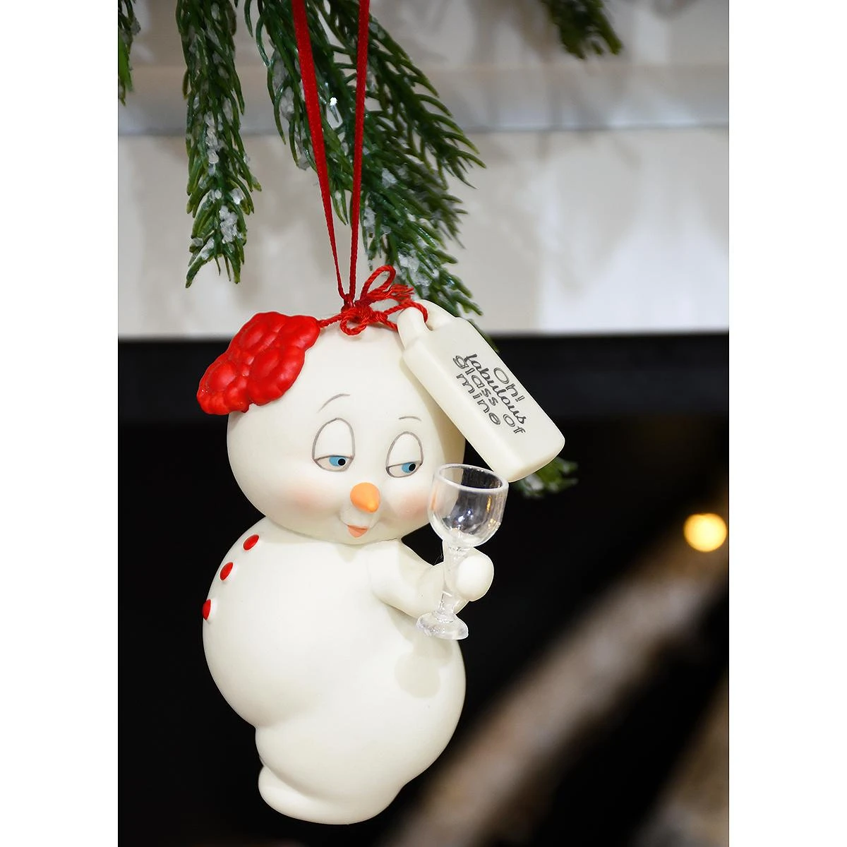 A Snowpinion®–wearing red flowers—gazes longingly at her empty wine glass. Artfully crafted of porcelain bisque, 3″ ornament comes ready to hang with a red ribbon. Sentiment tag reads: “Oh fabulous glass of mine”.