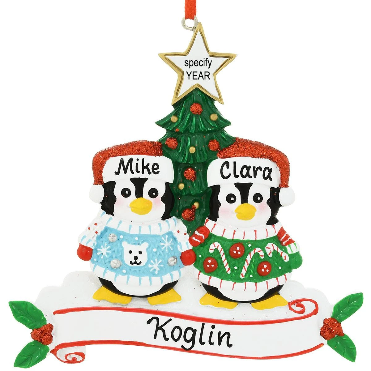 Please select the alternate image for a view of this 2 penguins in Christmas sweaters ornament without personalization.