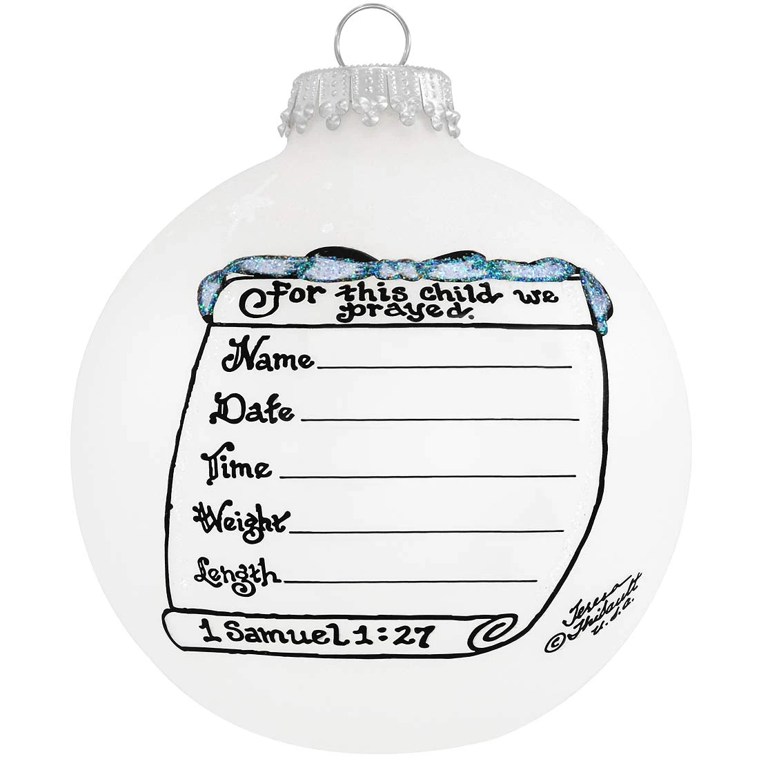 Uniquely crafted with inspired brush strokes and beautiful glitter accents, this charming 3ΒΌ” glass ornament is the perfect way to celebrate the beautiful miracle that has been born into your life! Handpainted in the U.S.A. from a design inspired by Teresa Thibault, this personalized baby boy birth statistics Heart Gifts ornament comes attractively packaged for easy gift giving. Sentiment on ornament reads: