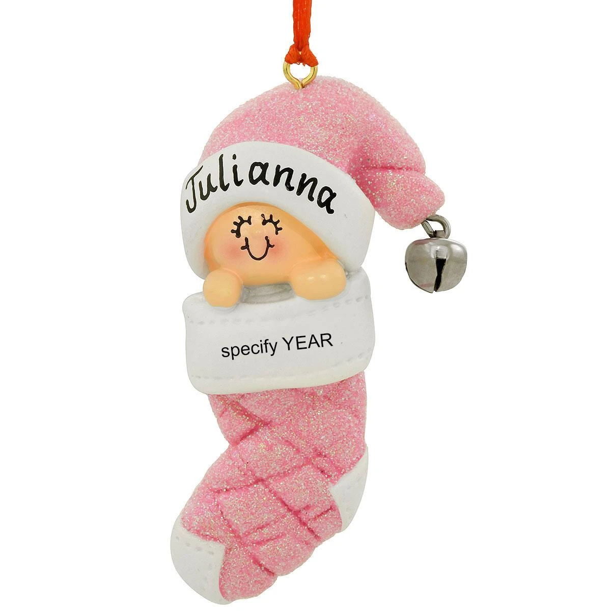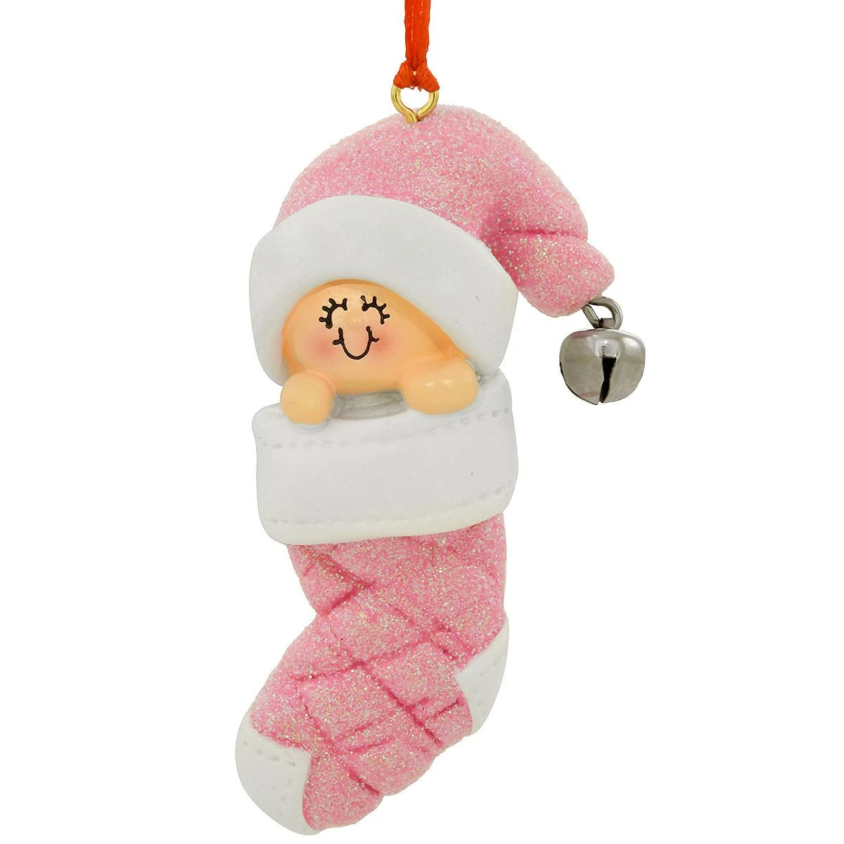 This little pink stocking holds a bundle of joy and precious memories of baby’s first year. Crafted of resin, our 3ΒΌ” baby in stocking ornament features an adorable girl smiling broadly in a pink hat with silver jingle bell. Embellished with shimmering pink glitter, this whimsical keepsake comes ready to hang on a red ribbon and is a perfect memento for babyβs first Christmas.