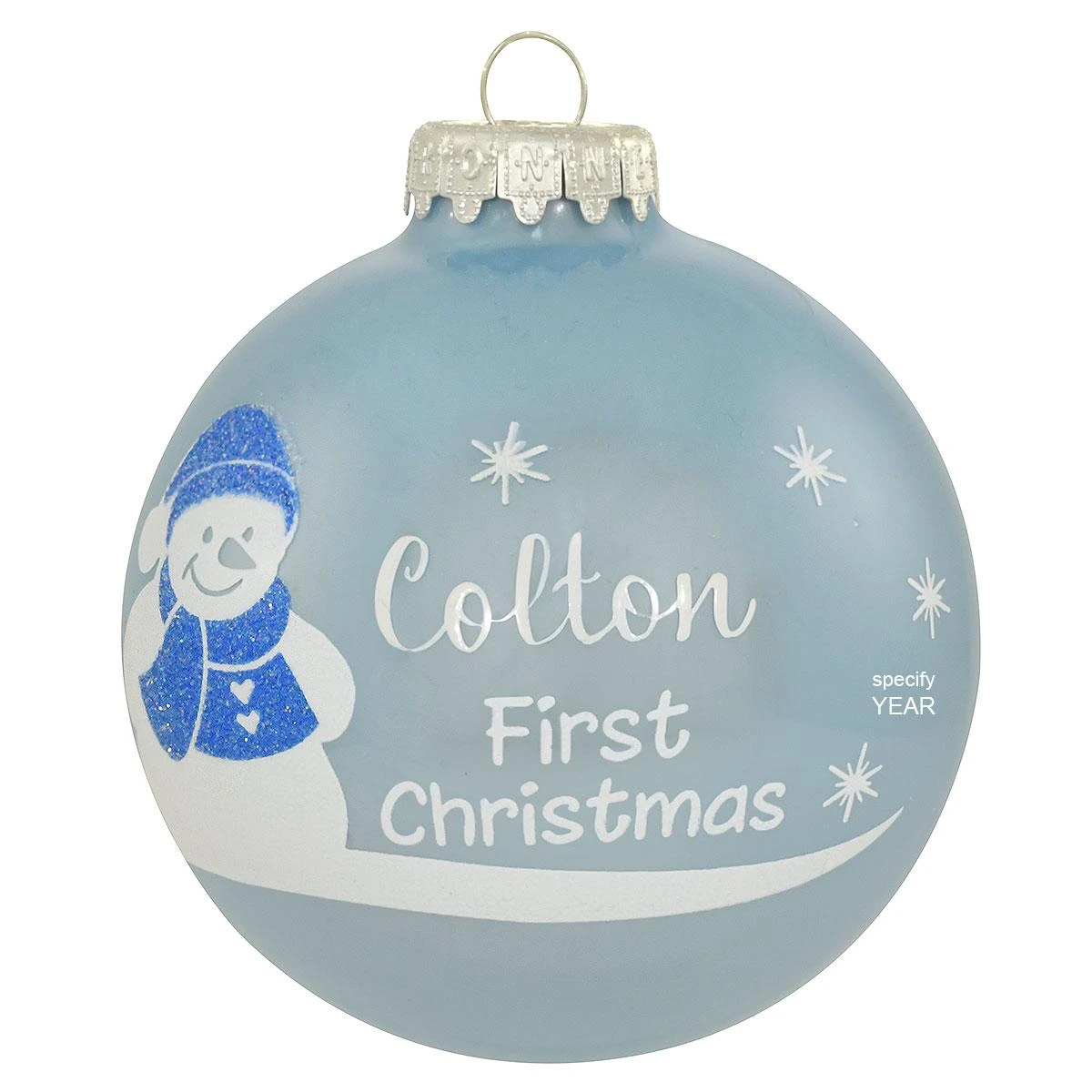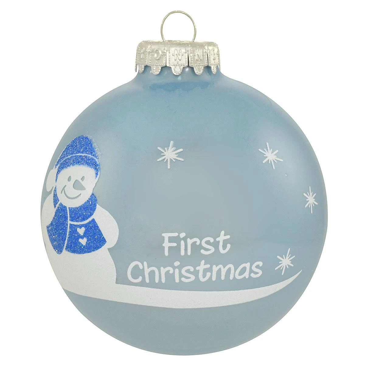 Photos and keepsakes will help keep your baby boy’s 1st special year a cherished memory as your little bundle of joy grows! Exclusively crafted for Bronner’s from glass in Hungary, our 3″ blue opal ornament is decorated with a glittery snowman in a charming snowfall with the words “First Christmas” in vivid white. This 1st Christmas ornament is a wonderful way to celebrate and commemorate the special occasion while creating a sentimental heirloom your loved one will be honored to receive. Allow one of our talented Bronner’s artists to hand-paint a special touch of personal-ity in white paint at no additional charge.