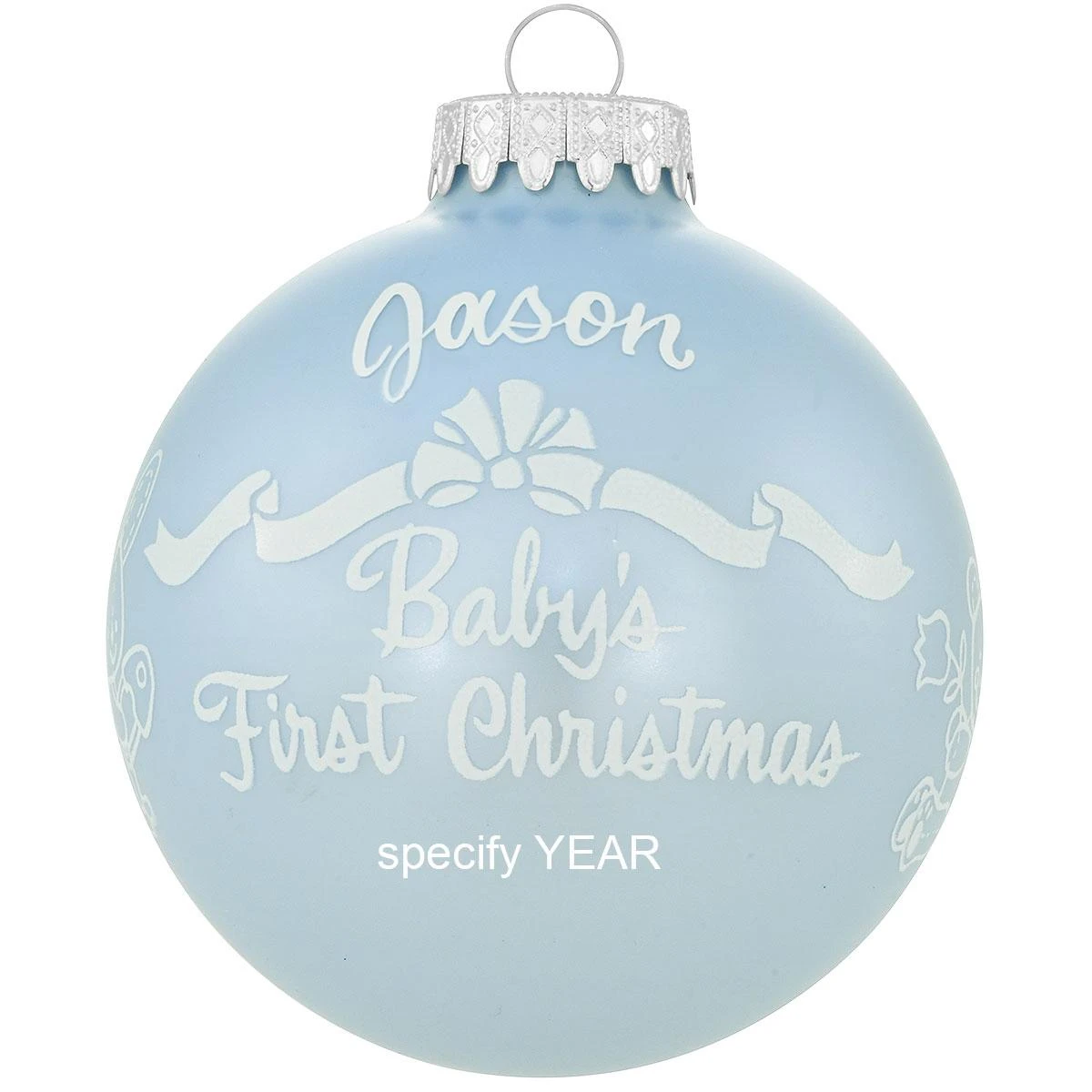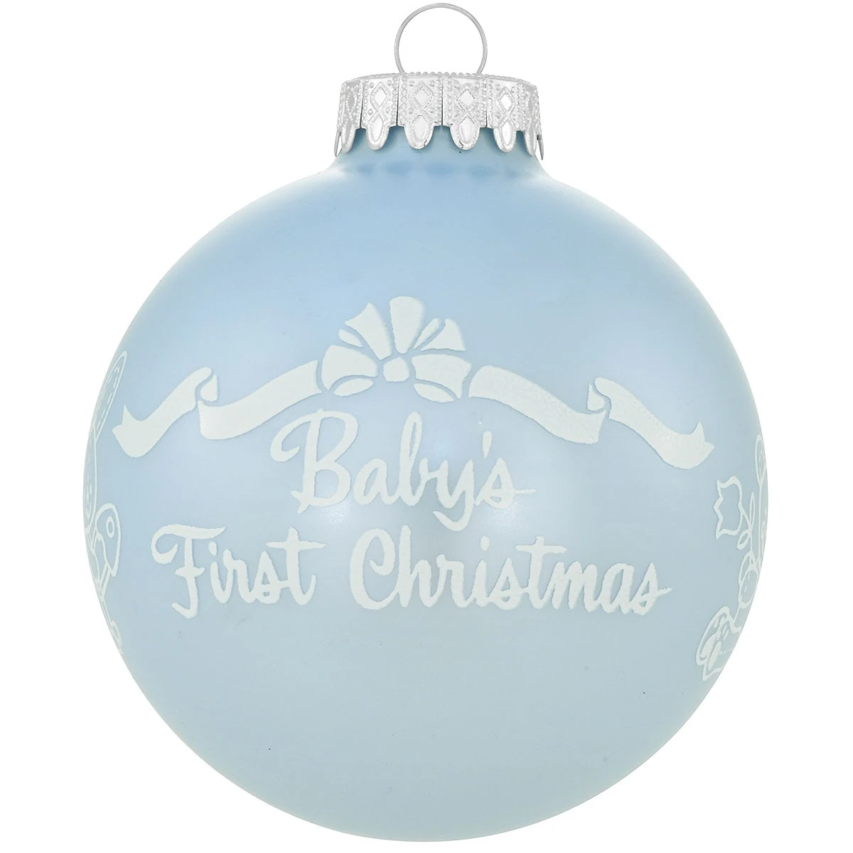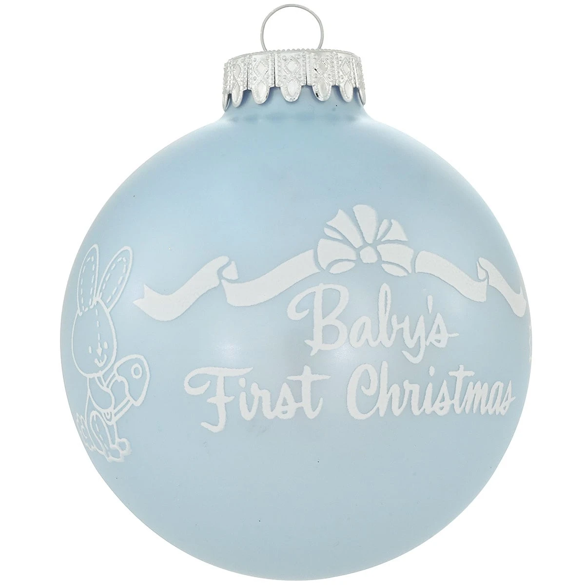 Celebrate the 1st Christmas of the newest member of the family with this special keepsake for the precious baby boy. Crafted exclusively for Bronner’s from glass in Hungary, our 4″ tall ornament features a light blue glossy surface with cute nursery designs in white depicting a bunny, teddy, bear and jack-in-the-box. Adorned with the sentiment Baby’s First Christmas, this unique baby’s first Christmas glossy blue ornament will make an ideal gift to welcome the new little bundle of joy. Allow one of our talented Bronner’s artists to hand-paint a personalized touch with stunning white paint at no additional charge.