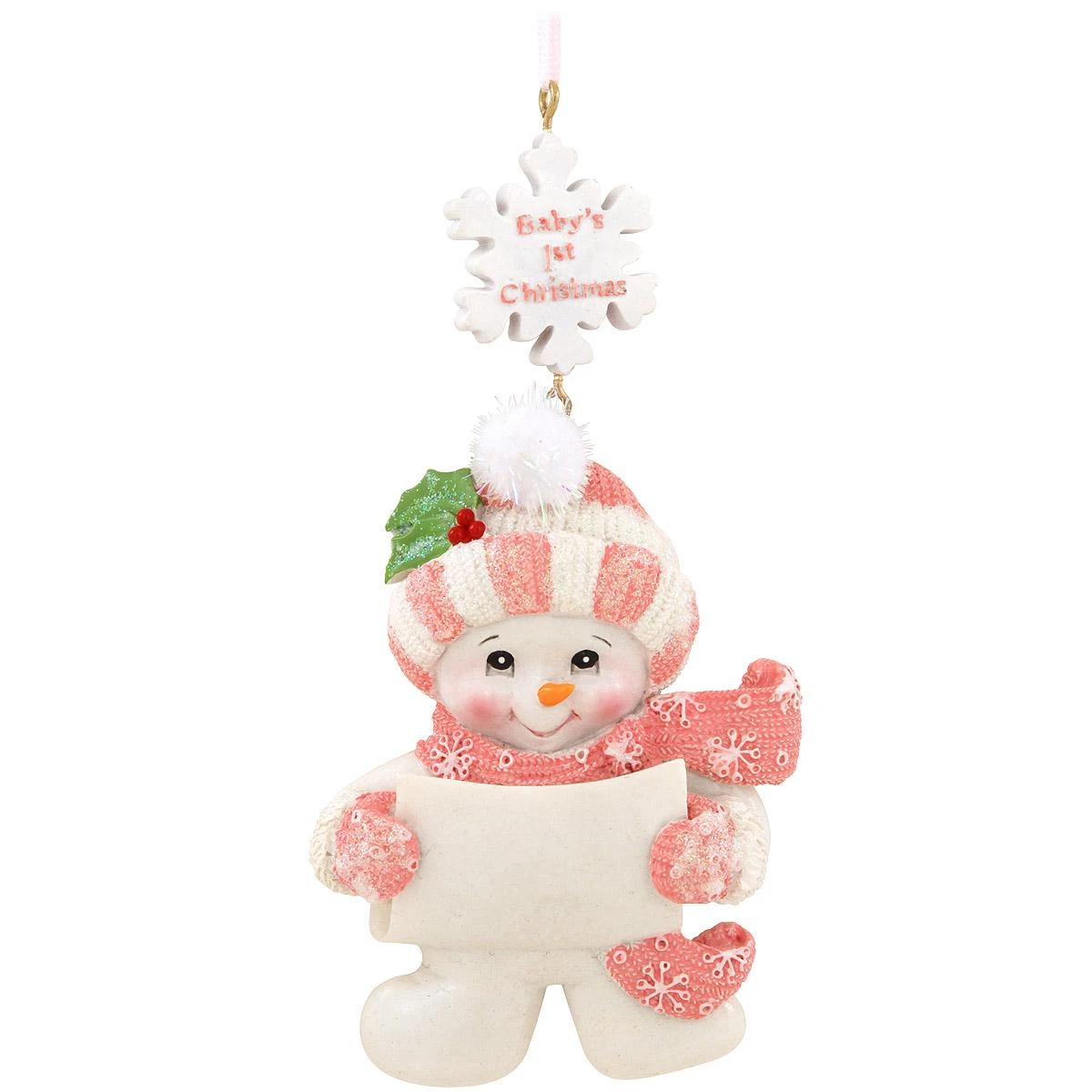 Remember baby’s special holiday with this sweet baby’s first Christmas snowman girl ornament! Crafted of resin, our snowman girl wears an adorable grin along with a darling pink and white knit ensemble. With a snowflake charm reading, Baby’s 1st Christmas, this 5½” tall personalized snowman girl ornament comes ready to hang with a pink cord. Allow one of our professional Bronner’s artists to add a personalized touch with a pink paint pen at no additional charge.