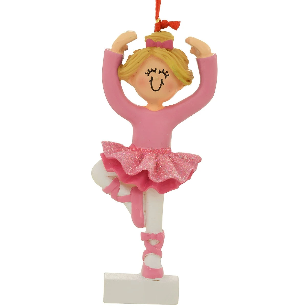 Your young dancer will leap for joy when she sees this ornament made especially for her! Pretty in pink, a young ballerina with blonde hair strikes and impressive pose balancing on one foot with arms curving gracefully above her head. Colorfully crafted of resin with sparkling glitter accents, this 4″ ornament comes ready to hang with a red ribbon.