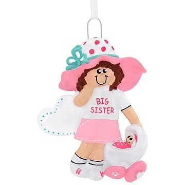 Dressed in her polka dot bonnet and pink skirt, this big sister is ready to tell her new little sibling all about her baby doll! Whether personalized with a black paint pen by our professional Bronner’s artists at no additional charge or plain, this charming big sister with a doll carriage ornament is sure to be a treasured keepsake with your loved one for years to come. With eye-catching glazes, this personalized big sister ornament is 3½” tall and crafted of resin. Comes ready to hang with a white ribbon.