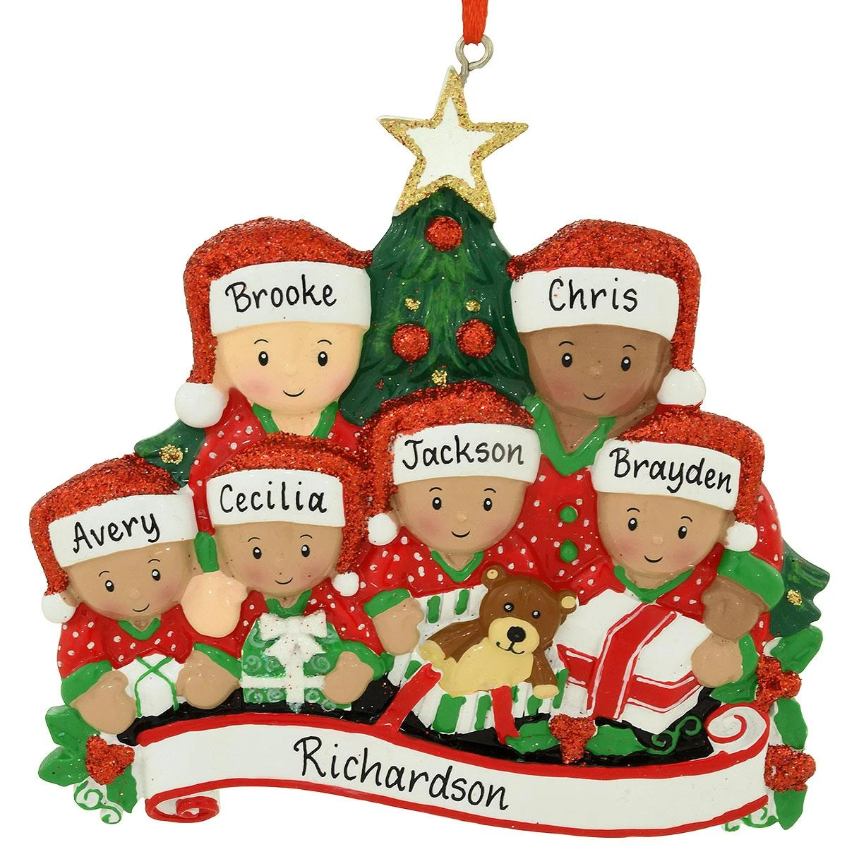 Gathering ’round the tree on Christmas morn in their matching pajamas, these 6 loved ones celebrate the best gift of allโthe “presence” of family! Artfully crafted of resin, our biracial family of 6 opening gifts ornament measures approximately 4ยผ” tall x 4ยผ” wide and is hand-painted in festive hues of red, green, and white with dazzling glitter accents. Coming ready to display on a red ribbon, this charming keepsake makes a great gift, especially when personalized by one of our professional Bronner’s artists at no additional charge!