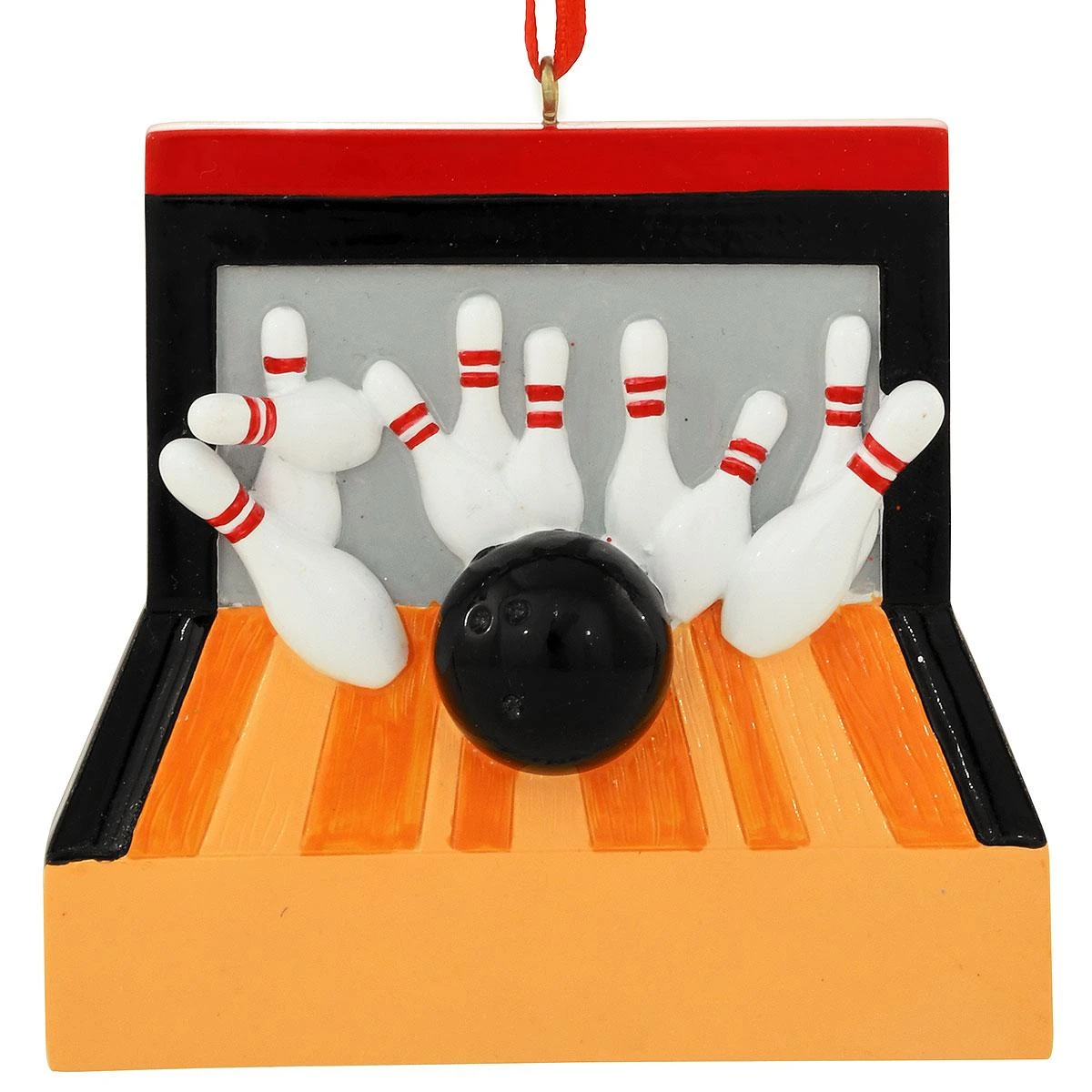 You’ll score big with this “strike”-ing gift for your bowler! Depicting the moment when a well thrown bowling ball sends all ten pins crashing down, our bowling lane ornament comes ready to hang with a red ribbon. Expertly crafted of resin with vivid glazes of orange, black, red, and white, this unique Bronner’s exclusive ornament  measures 3¼” tall and can be personalized for your special bowler with a black paint pen at no additional charge.