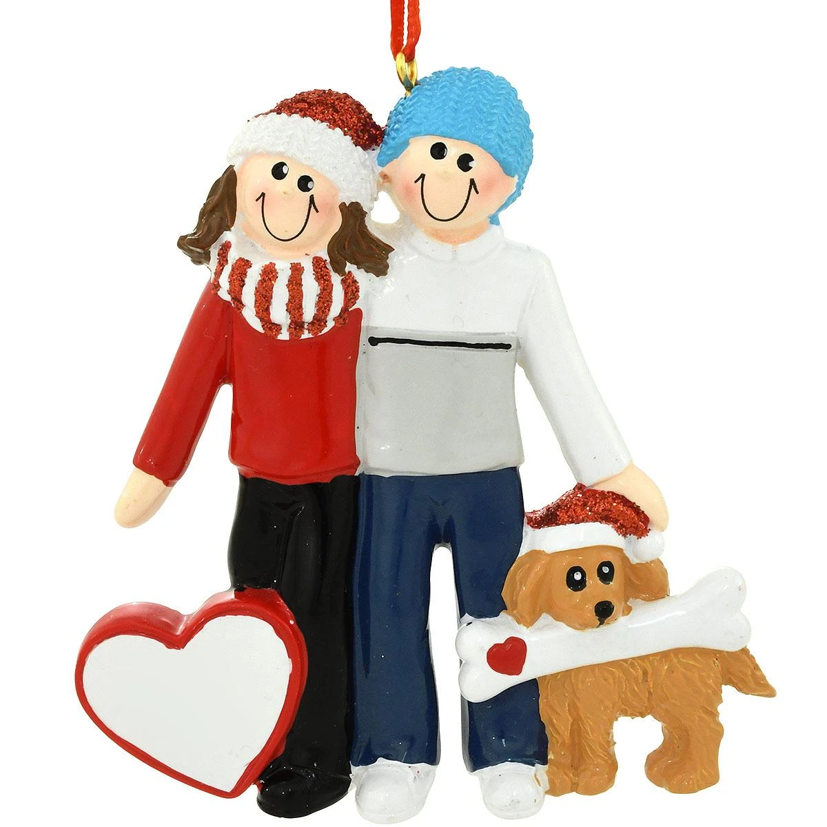 Our happy couple is starting the season on the right paw by including their “fur baby” in their holiday plans! All are dressed in festive winter caps while the pup enjoys a giant bone. Adorned with a large heart and touches of sparkling red glitter, our 3¾” couple with dog ornament comes ready to hang with a red ribbon. For a unique gift with personal-ity™, why not allow one of our professional Bronner’s artists to personalize this keepsake with a black paint pen at no additional charge?