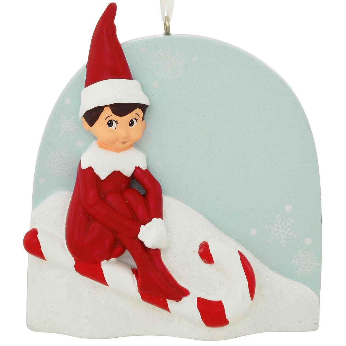 He’s been watching and Santa’s special helper knows exactly who’s been naughty or nice! Depicting the Elf on the Shelf sliding down a snowy hill on a candy cane, this adorable ornament makes a great gift for the “good” kids on your Christmas list—especially when personalized by Bronner’s with a black paint pen at no additional charge.