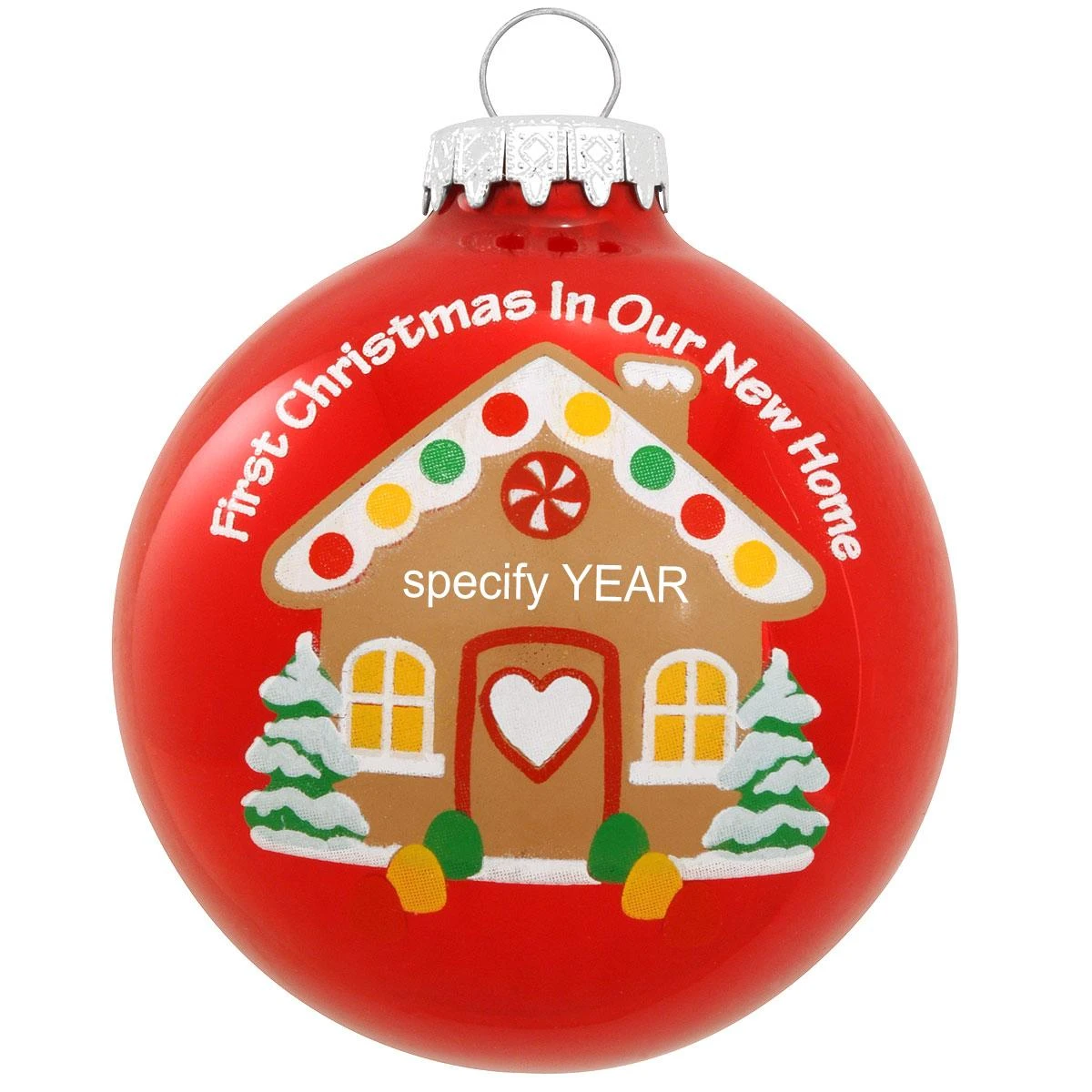 Whether it’s your first home or tenth, there’s something sweet about a new home that’s worth savoring! Depicting a darling gingerbread house decorated with gumdrops and a candy swirl, this enchanting keepsake features the sentiment First Christmas In Our New Home. Artfully crafted of glass in Hungary exclusively for Bronner’s, this 3″ tall first Christmas in our new home gingerbread house ornament can be personal-izedâ„¢ by one of our talented Bronner’s artists with a white paint pen at no additional charge.
