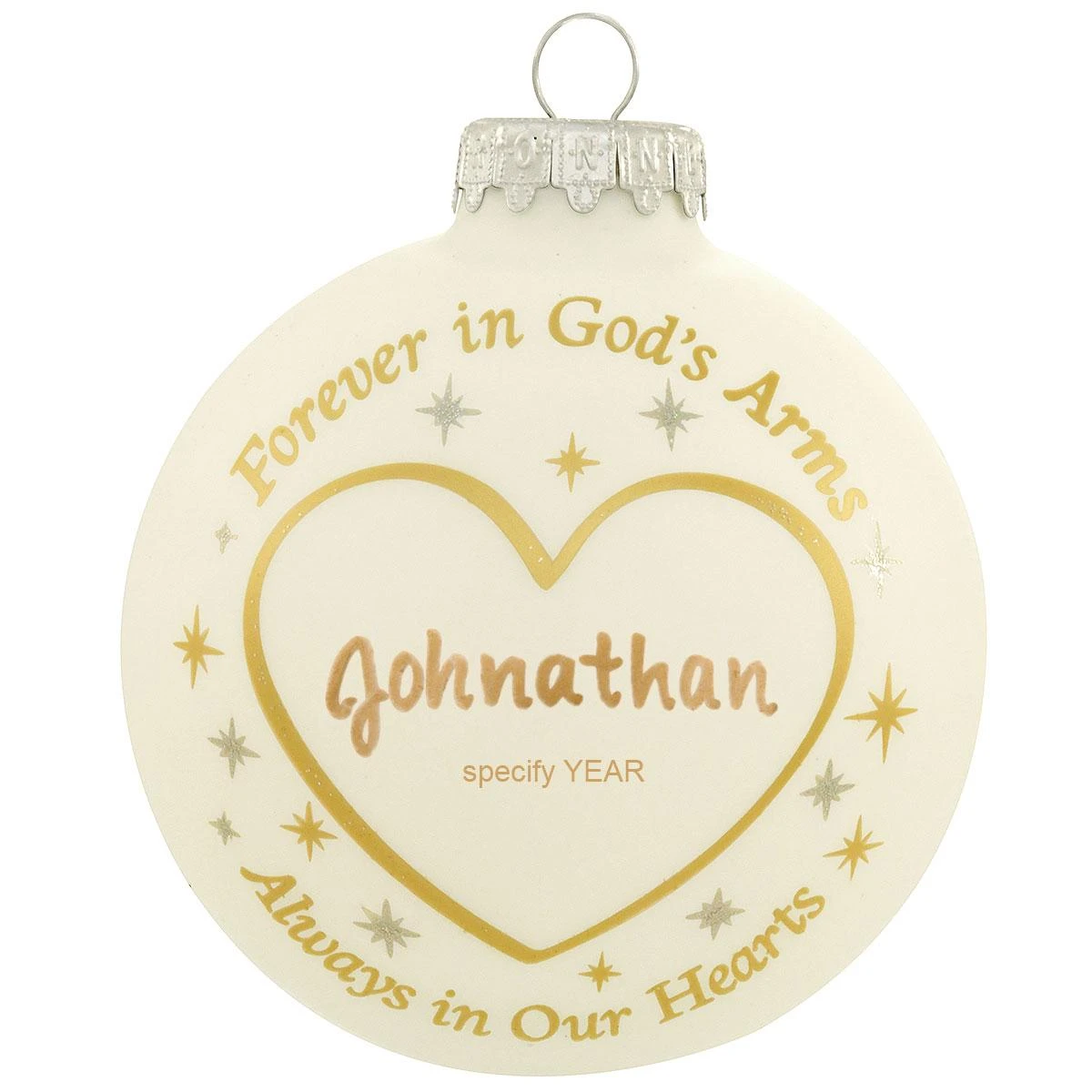 Commemorate the life of a loved one that has passed on with this unique personalized keepsake. Artfully crafted of glass from Hungary, our 3″ tall ornament has a smooth ivory tone finish and features the sentiment Forever in God’s Arms Always in Our Hearts, which appears above and below a heart shape in a metallic gold finish. Accented with a pattern of alternating silver glitter and gold enamel stars, this Bronner’s exclusive ornament can be personalized with the name of your loved one by one of our professional Bronner’s artists with a gold paint pen at no additional charge.
