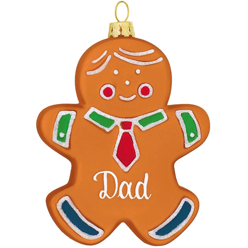 Have a sweet dad? Why not spice up his tree with this taste-ful design? With sparkling glitter accents and coming ready to hang with a gold cord, our Bronner’s exclusive 4″ tall gingerbread dad glass ornament is artfully iced with a dapper haircut, shirt, and tie. Allow one of our professional Bronner’s artists to hand-paint a personalized touch on this tempting treat in vivid white paint at no additional charge!