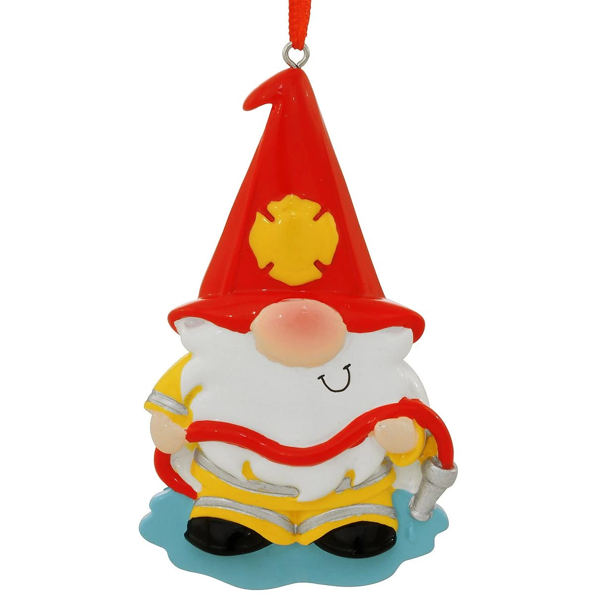 Need a cool gift for your favorite firefighter? This colorful 3¾” ornament depicts a gnome in firefighter gear and tall cap with badge holding a firehose. Resin keepsake comes ready to hang on a red ribbon.Â