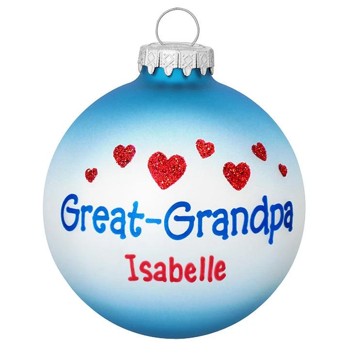 Cherish the blessing of being able to celebrate that special gentleman in your life with this Great-Grandpa with hearts ornament! Exclusively crafted for Bronner’s from glass in Hungary, our 3″ tall ornament embellishes the two-tone blue and white satin surface with glittery red hearts and a title of Great-Grandpa printed in blue that any man would be proud to hold. Allow one of our talented Bronner’s artists to add a personalized touch with a red paint pen at no additional charge to this unique family ornament with hearts.