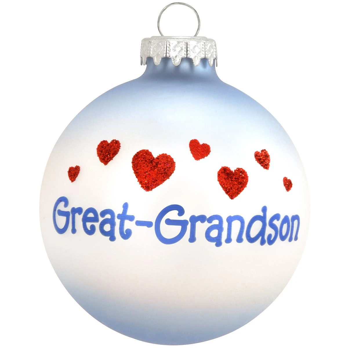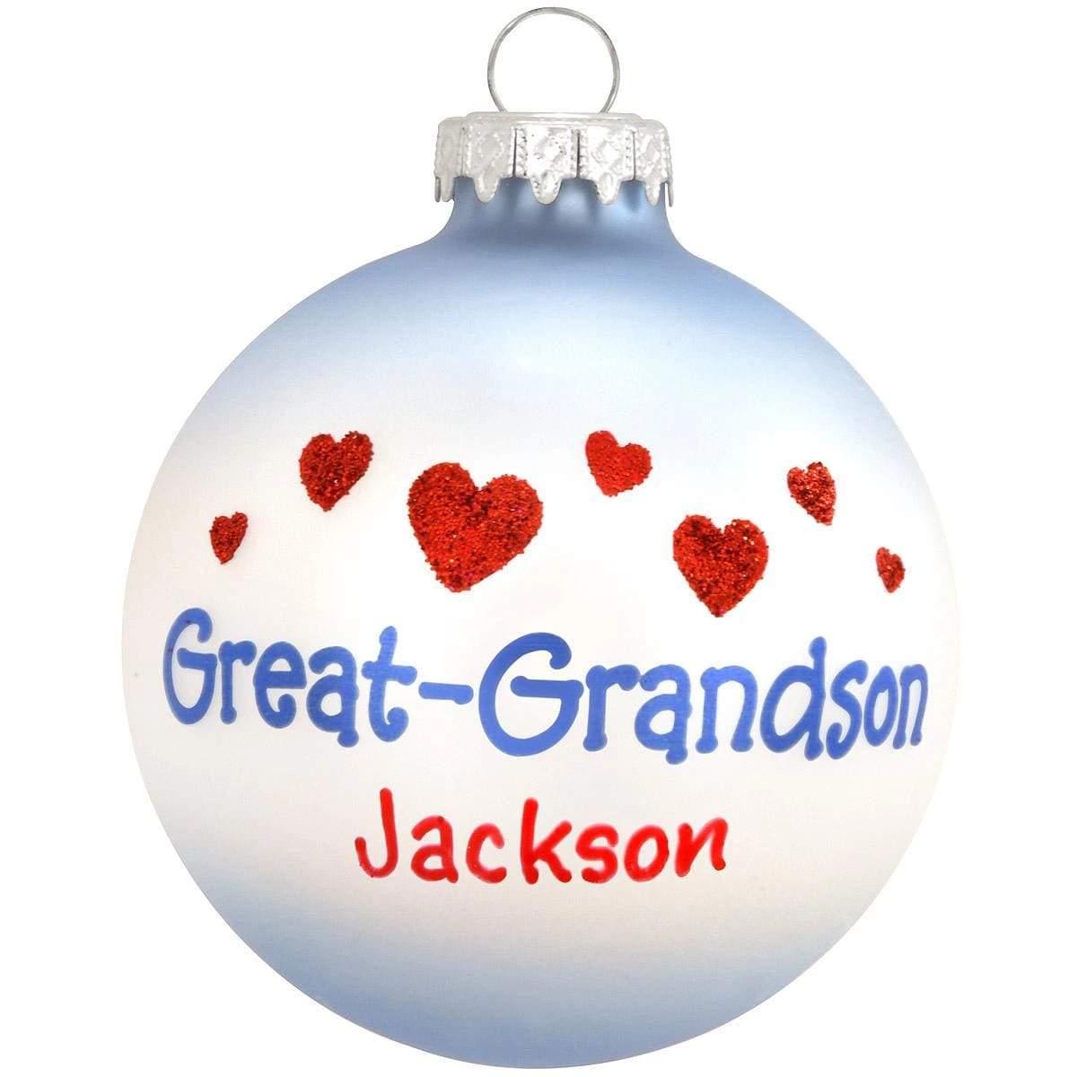 The only thing better than a grandson is a great-grandson! Exclusively crafted for Bronner’s from Hungary, our 3″ tall personalized great-grandson glass ornament has a two-tone blue and white satin surface embellished with a pattern of glittery red hearts above the designation Great-Grandson. Allow one of our professional Bronner’s artists to add a personalized touch with a red paint pen at no additional charge to this unique family ornament with hearts.