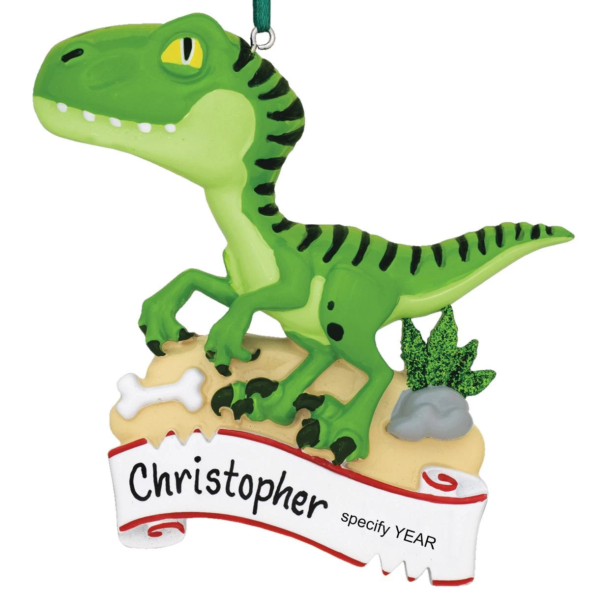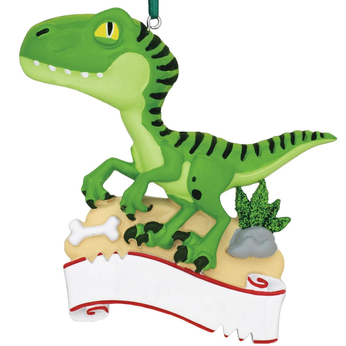 Sure to deliver dino-mite Christmas fun, our green Velociraptor ornament depicts the dinosaur standing atop a prehistoric backdrop. Crafted of resin in vivid hues of green and tan, this 3ΒΌ” tall x 3ΒΎ” wide raptor keepsake comes ready to hang with a green ribbon and can be personalized for your dinosaur lover by one of our professional Bronner’s artists in black paint pen at no additional charge.