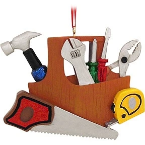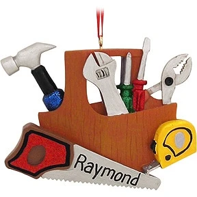 Fix up the handyman in your life with a gift that will repair his or her tree with hard working style for years to come! Coming ready to hang with a red ribbon, this 3¼” tall resin ornament features a box full of handyman tools that are craftily detailed with glittering accents. Allow one of our professional Bronner’s artists to add a personal touch with a black paint pen at no additional charge. Please select the alternate image for a view of this personalized handyman tools ornament without personalization.