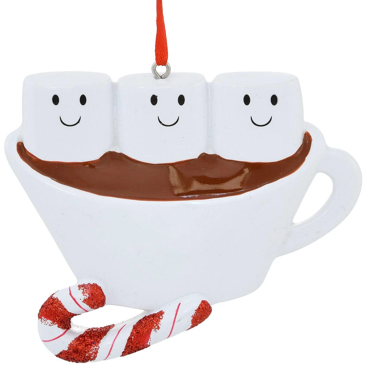 Life’s little pleasures are so much “sweeter” when shared with the ones you love! Complete with a candy cane striped with red glitter, our hot cocoa family of 3 ornament depicts three smiling marshmallows in a cup of hot chocolate. Crafted of resin and coming ready to hang with a red ribbon, this 3″ tall x 3½” wide keepsake is a taste-ful gift your special family will savor for years to come! Allow one of our talented Bronner’s artists to add a personalized touch using a black paint pen at no additional charge.