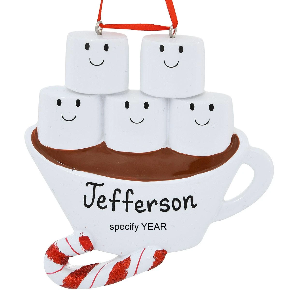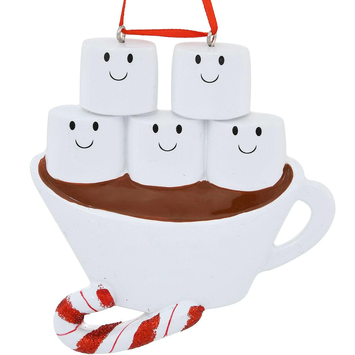 Life’s little pleasures are so much “sweeter” when shared with the ones you love! Complete with a candy cane striped with red glitter, our hot cocoa family of 5 ornament depicts five smiling marshmallows in a cup of hot chocolate. Crafted of resin and coming ready to hang with a red ribbon, this 3¾” tall x 3½” wide keepsake is a taste-ful gift your special family will savor for years to come! Allow one of our talented Bronner’s artists to add a personalized touch using a black paint pen at no additional charge.