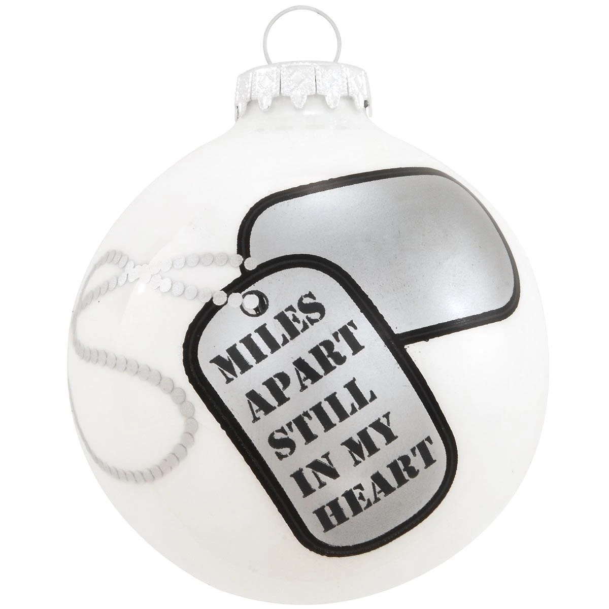 Distance cannot separate the love you have for your brave soldier. Salute your favorite serviceman or woman with this special gift from the heart! Artfully crafted of glass in Hungary exclusively for Bronner’s, this shimmering white 3″ round ornament depicts a pair of silver “dog tags” adorned with the sentiment “MILES APART STILL IN MY HEART.” A great memento for families apart from their soldiers this Christmas, this loving keepsake can be personalized by one of our talented Bronner’s artists using a black paint pen at no additional charge.