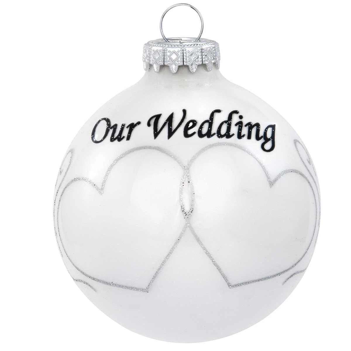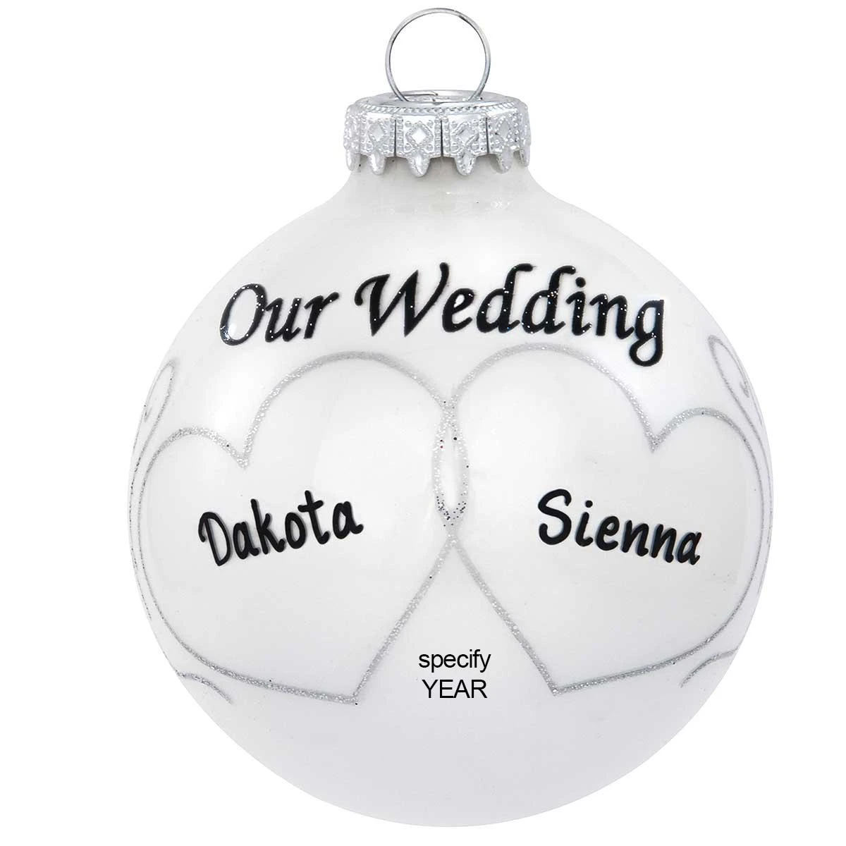 This beautiful ornament is a heart-felt choice for the special couple in your life joining together! Skillfully crafted of glass exclusively for Bronner’s from Hungary, our beautiful 3″ round enameled white ornament features the sentiment “Our Wedding” which appears in rich black. A pattern of silver hearts and graceful swirls artfully accented with subtle touches of glitter completes the love-ly design. Allow one of Bronner’s artists to add the names of your special couple to this Our Wedding Hearts ornament with a black paint pen at no additional charge.