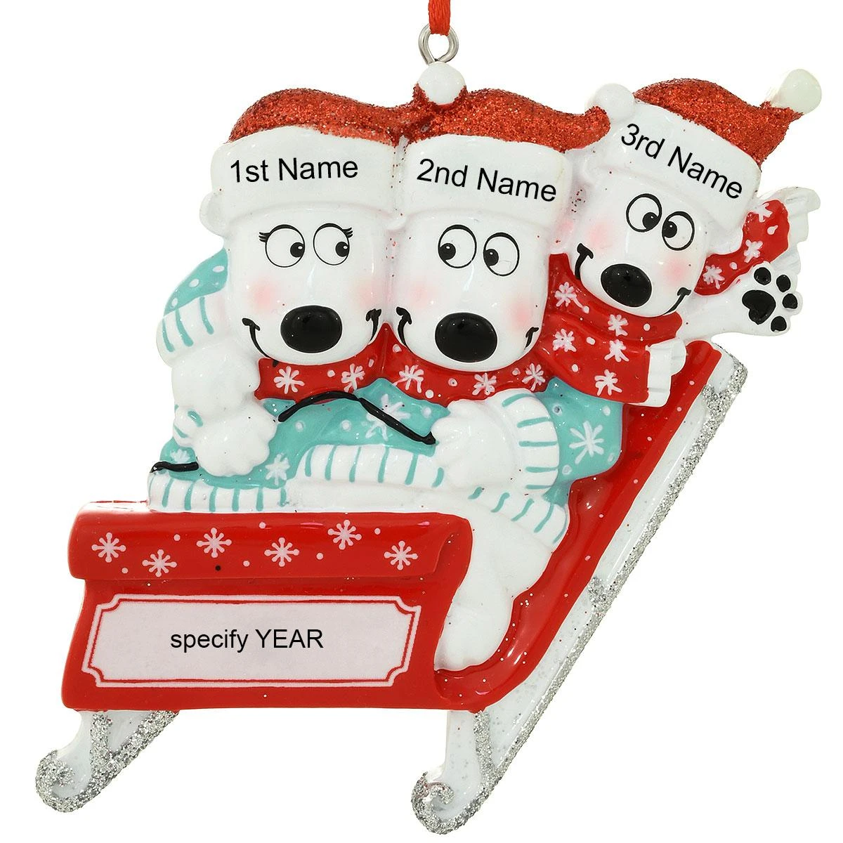 Adventure runs in the family with this beary cute clan! Zooming downhill in their bright red sled, our polar bear family of 3 are dressed in colorful aqua sweaters, red scarves and festive Santa hats. Accented with a charming snowflake motif, this adorable resin ornament is artfully hand-painted with vibrant glazes and sparkling glitter accents and comes ready to hang with a red ribbon with a hanging height of approximately 3½”. Perfect for your special family of three, this fun keepsake can personalized to showcase their personal-ityâ„¢ by one of our talented Bronner’s artists with a black paint pen at no additional charge.