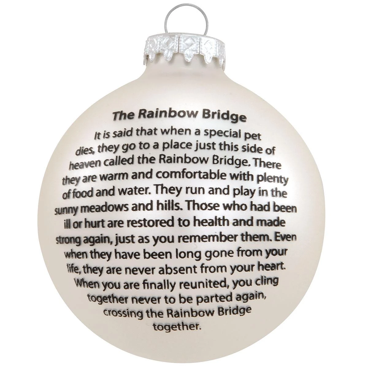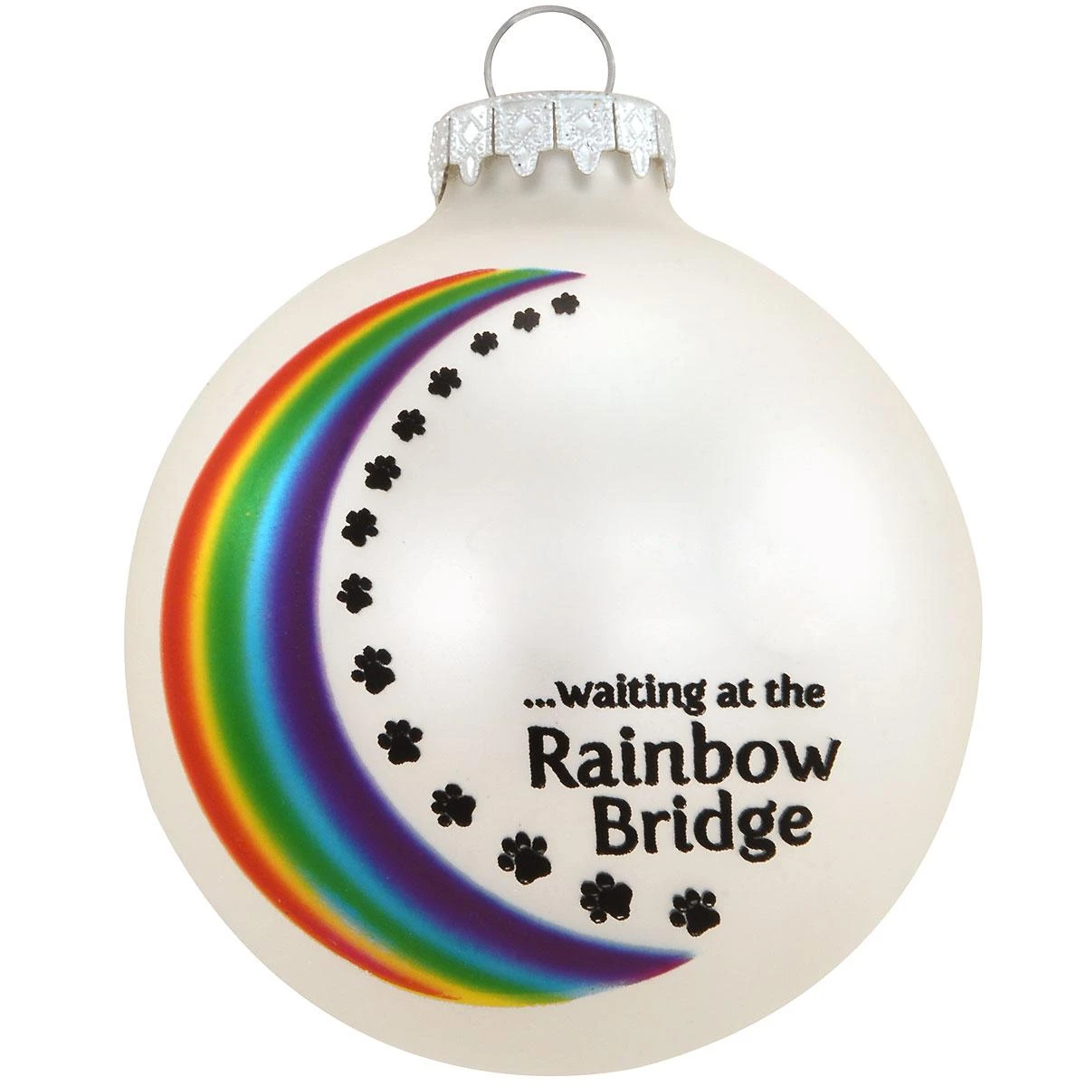 Remember a special pet who, though gone from your life, is never absent from your heart. Our personalized rainbow bridge pet remembrance ornament is artfully crafted of glass from Hungary and features a trail of paw prints next to a colorful rainbow along with the words โฆwaiting at the Rainbow Bridge. Printed on the reverse side of this Bronner’s exclusive 3″ tall keepsake is a sunny vision of pet life at the rainbow bridge where there’s plenty of food and water and sunny meadows to romp and play. Allow one of our talented Bronner’s artists to add a personalized touch with a black paint pen at no additional charge.