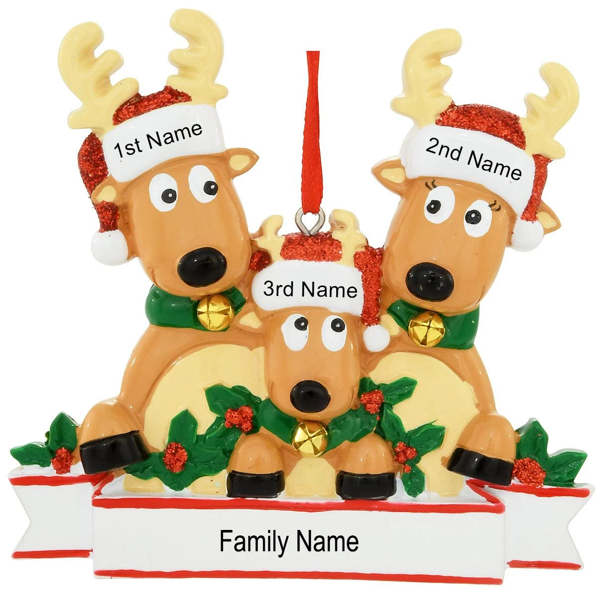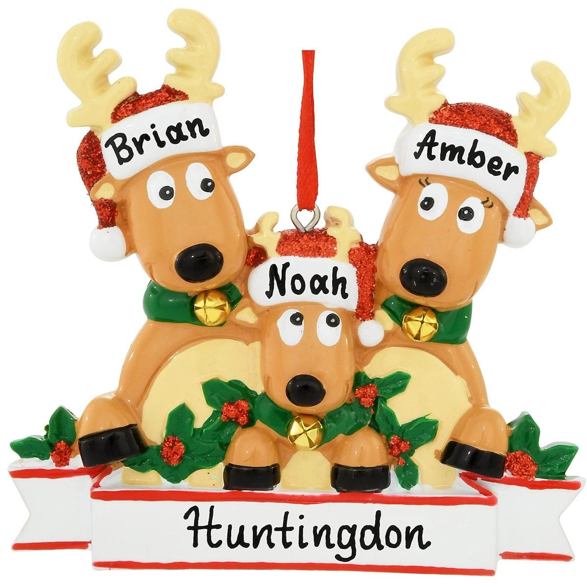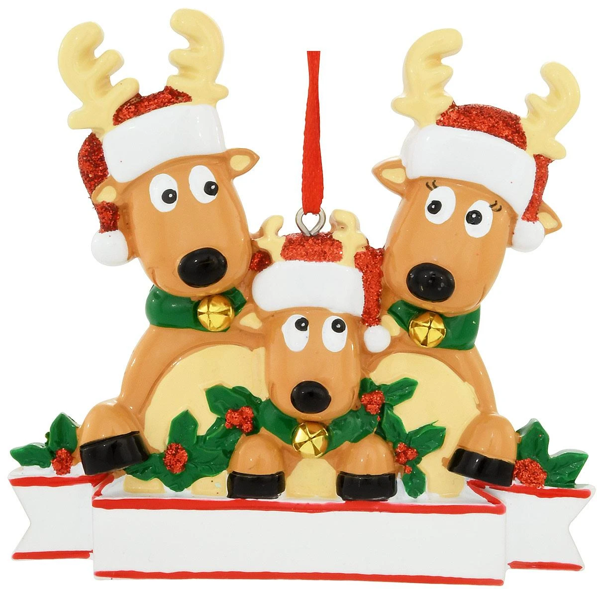 Make room on the family tree for this deer design! Portraying three reindeer with antlers and Santa hats wearing collars adorned with gold jingle bells, our adorable reindeer family of 3 ornament is colorfully crafted of resin and measures 3½” tall x 3¾” wide. With dazzling red glitter and a festive holly and berry motif, this cute keepsake comes ready to hang with a red ribbon and can be personalized by one of our talented Bronner’s artists with a black paint pen at no additional charge.