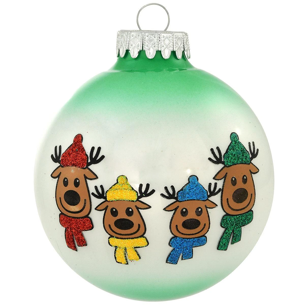 Is your family filled with “sparkling personalities”? Custom made for your special “herd”, this colorful keepsake features a smiling reindeer family of 4 all bundled up in glittering hats and scarves of red, yellow, blue and green. Crafted of glass in Hungary exclusively for Bronner’s, this adorable ornament features a bright 2-tone green and white surface and measures 4″ round. Why not have this special family keepsake personalized by one of our talented Bronner’s artists with a black paint pen at no additional charge?