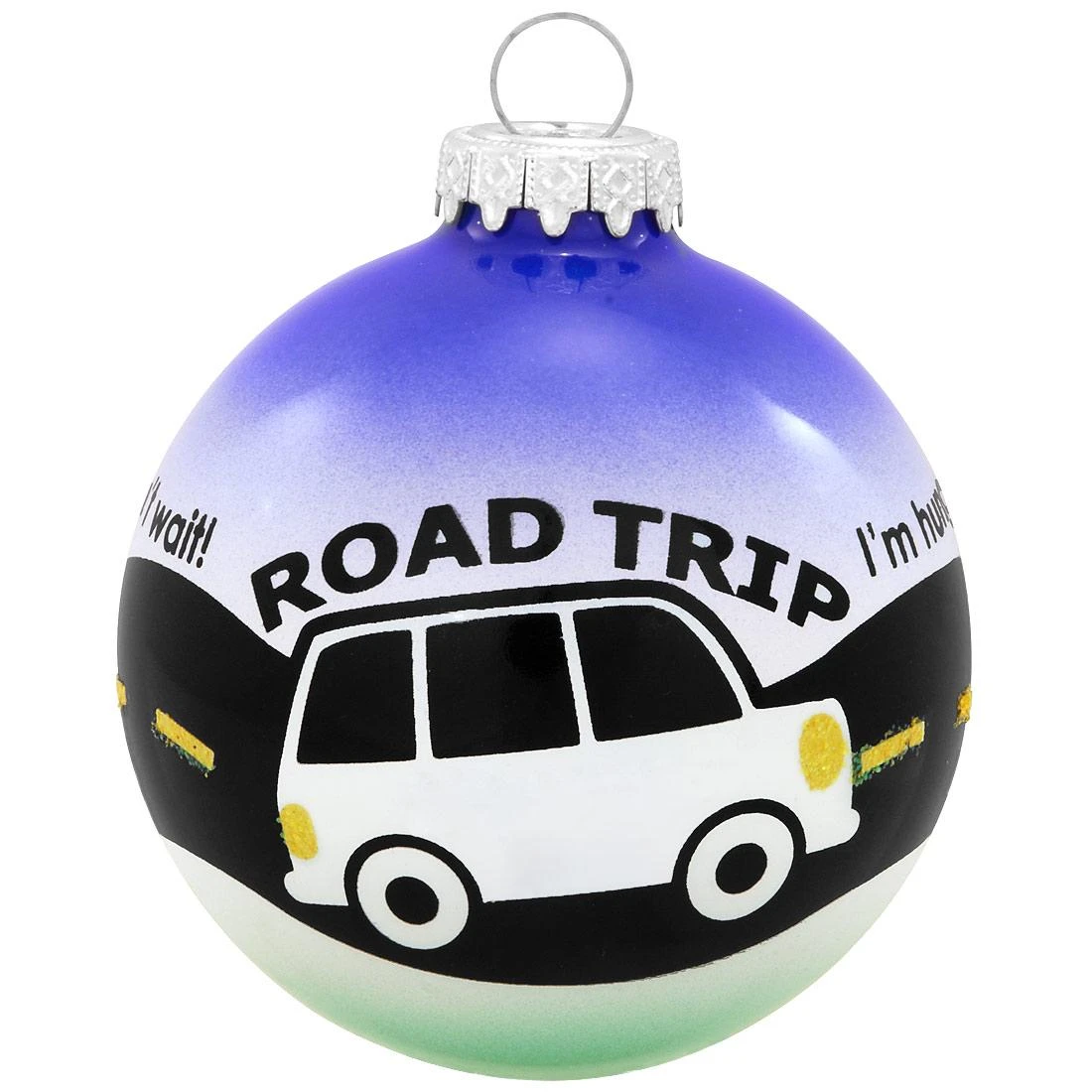 Delivering miles of smiles, our clever traveling ornament is sure to take you on a trip down memory lane! Exclusively crafted for Bronner’s from glass in Hungary, our 3″ tall ornament features a three-tone landscape of sky blue, white, and grass green interrupted by a winding road, automobile, and humorous sentiments which include:
