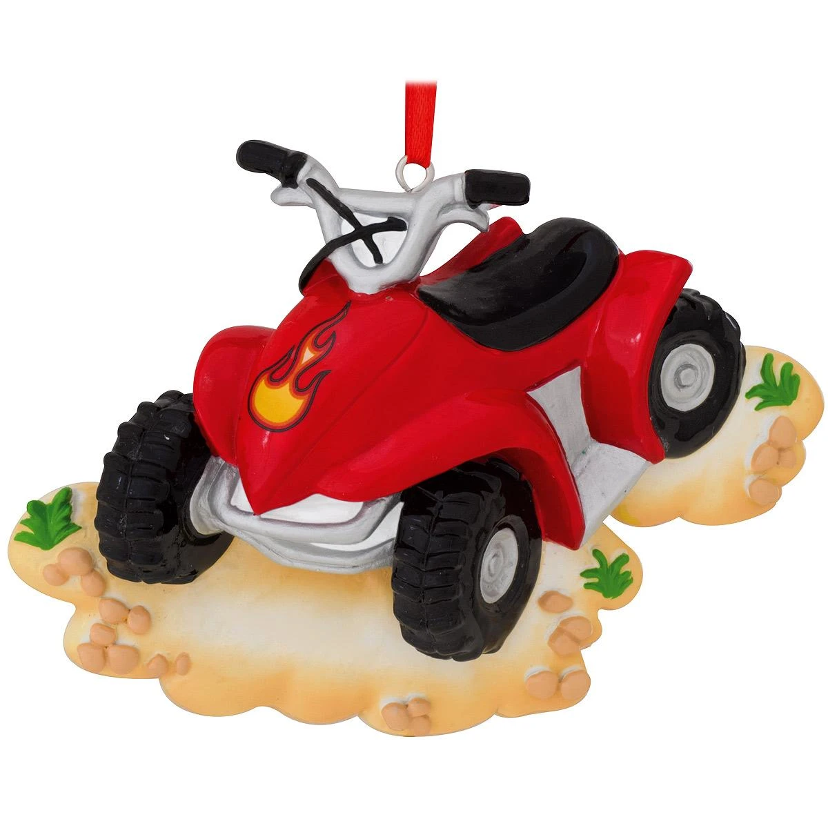 Mud, rocks, and tall grass are no match for this powerful quad! Artfully detailed in resin, our four wheeler ornament measures 3″ tall by 4″ wide and features a bright red paint job complete with yellow flames sure to ignite the passion of your ATV lover. Coming ready to hang with a red ribbon, this wheely cool keepsake can be personalized with the name of your choice by one of our talented Bronner’s artists with a black paint pen at no additional charge.
