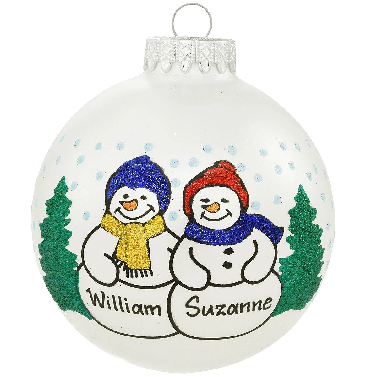 Love, family, and friendship to last a hundred years! Crafted of glass exclusively for Bronner’s from Hungary, this 4″ tall ornament features two beautiful snowmen in a wintry forest scene with glitter accents for an added appeal. This adorable snowman couple ornament is sure to make a delightful addition to anyone’s Christmas tree for years to come! Allow one of our professional Bronner’s artists to add a personal touch with a black paint pen at no additional charge!