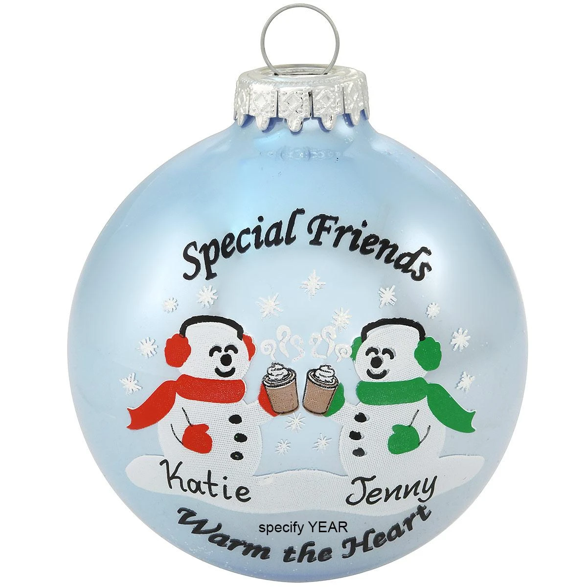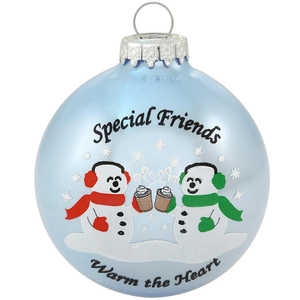 Snowbody will be able to resist this personalized special friends warm heart ornament! A close friendship can warm even the coldest day, and our beautiful special friends ornament will make a heartwarming addition to your holiday tree! Exclusively crafted for Bronners from glass in Hungary, this 3″ tall ornament features a couple of adorable snowmen dressed for the weather with mugs of hot cocoa artfully printed along a sky blue opal surface. Embracing these frosty friends is the sweet sentiment, Special Friends Warm the Heart. Whether personalized with a black paint pen by our professional Bronner’s artists at no additional charge or plain, this charming special friends warm heart glass ornament is sure to be a treasured keepsake with your loved one for years to come!