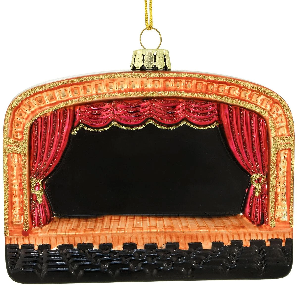 In “show stopping” hues of orange, black, and red, this charming personalized theatre stage ornament is designed to showcase your loved one’s thespian achievements. Depicting a stage framed with lavish draperies and theatre seats in the foreground, this charming Bronner’s exclusive theater ornament measures 3ΒΌ” tall x 4Β½” wide and is artfully crafted of glass. Accented with shimmering glitter and coming ready to hang with a gold cord, this dazzling curtained stage form ornament is sure to enjoy many “repeat performances” on your actor’s tree for many seasons to come! Allow one of our talented Bronner’s artists to add a touch of personal-ityβ’ with gold paint pen at no additional charge.