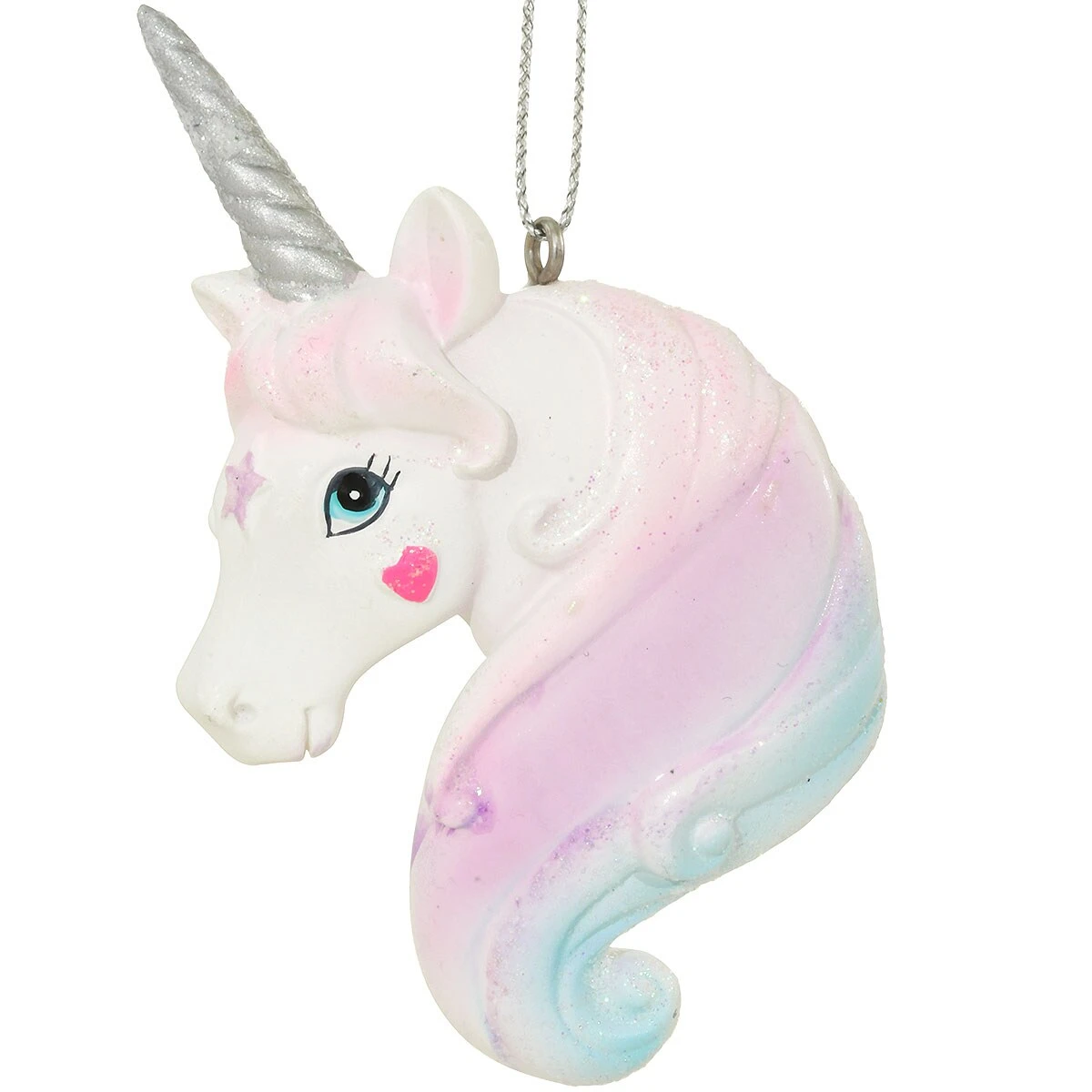 Our “enchanting” creature is sure to point your attention in the right direction this holiday season … right to the tree! Crafted from resin, this 3½” tall ornament depicts the bust of a unicorn with a star on her forehead and heart-blushed cheeks with a shimmering silver spiral horn atop a a flowing mane of pink, purple and blue. Iridescent glitter accents add all the magical appeal fairytales are made of! Comes ready to hang with a silver cord.Â