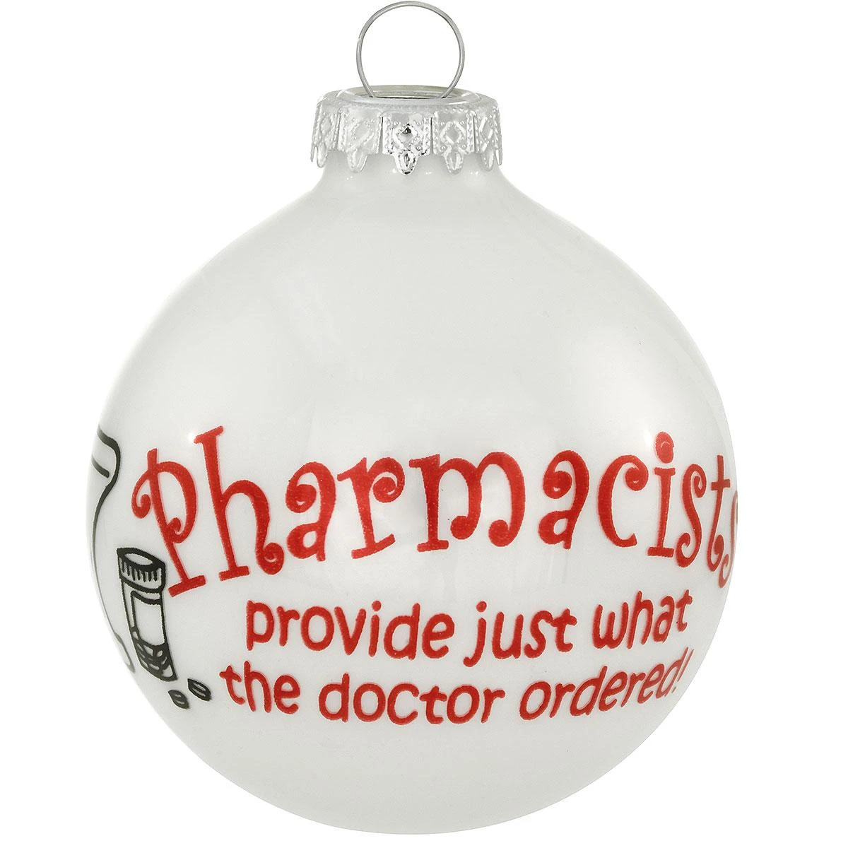 Featuring a vivid red pharmacist sentiment, this shimmering white opal ornament depicts symbols of the occupation—a prescription bottle and old-fashioned mortar bowl and pestle. Crafted in Hungary exclusively for Bronner’s, our glass ornament measures 3″ round. Sentiment reads: Pharmacists provide just what the doctor ordered! This charming pharmacist ornament is sure to be a treasured keepsake for years to come!