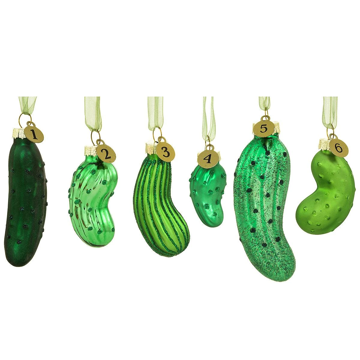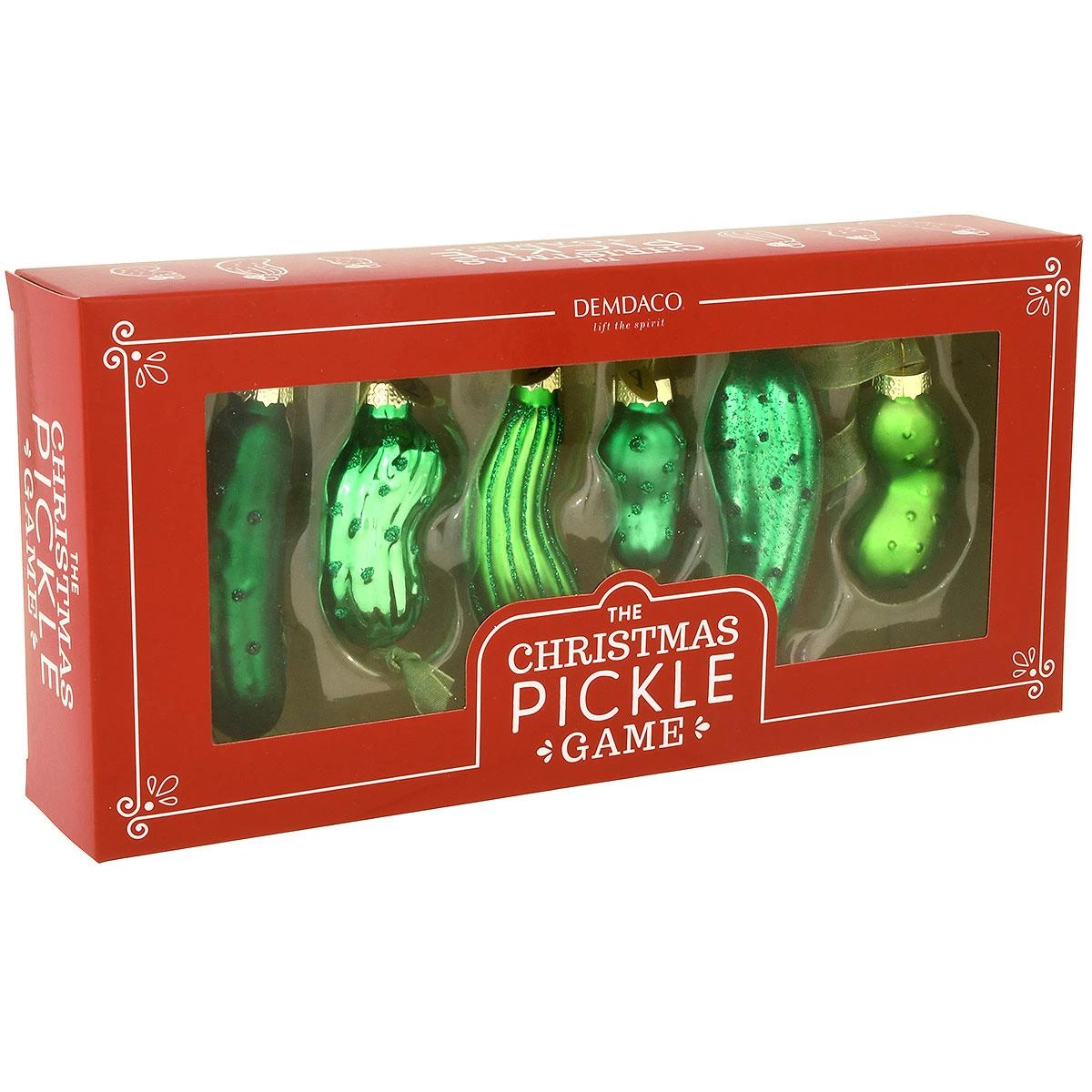 Santa doesn’t dilly-dally when it comes to Christmas fun—he enjoys hiding pickle ornaments on the tree for the whole family to find! This charming set of glass ornaments features 6 different pickles, each bearing a numbered tag and coming ready to hang on a gossamer ribbon. Game suggestions are included on back of box, or get creative each year and invent new games to play! Ornaments range in size from 1½” – 3¼” tall.