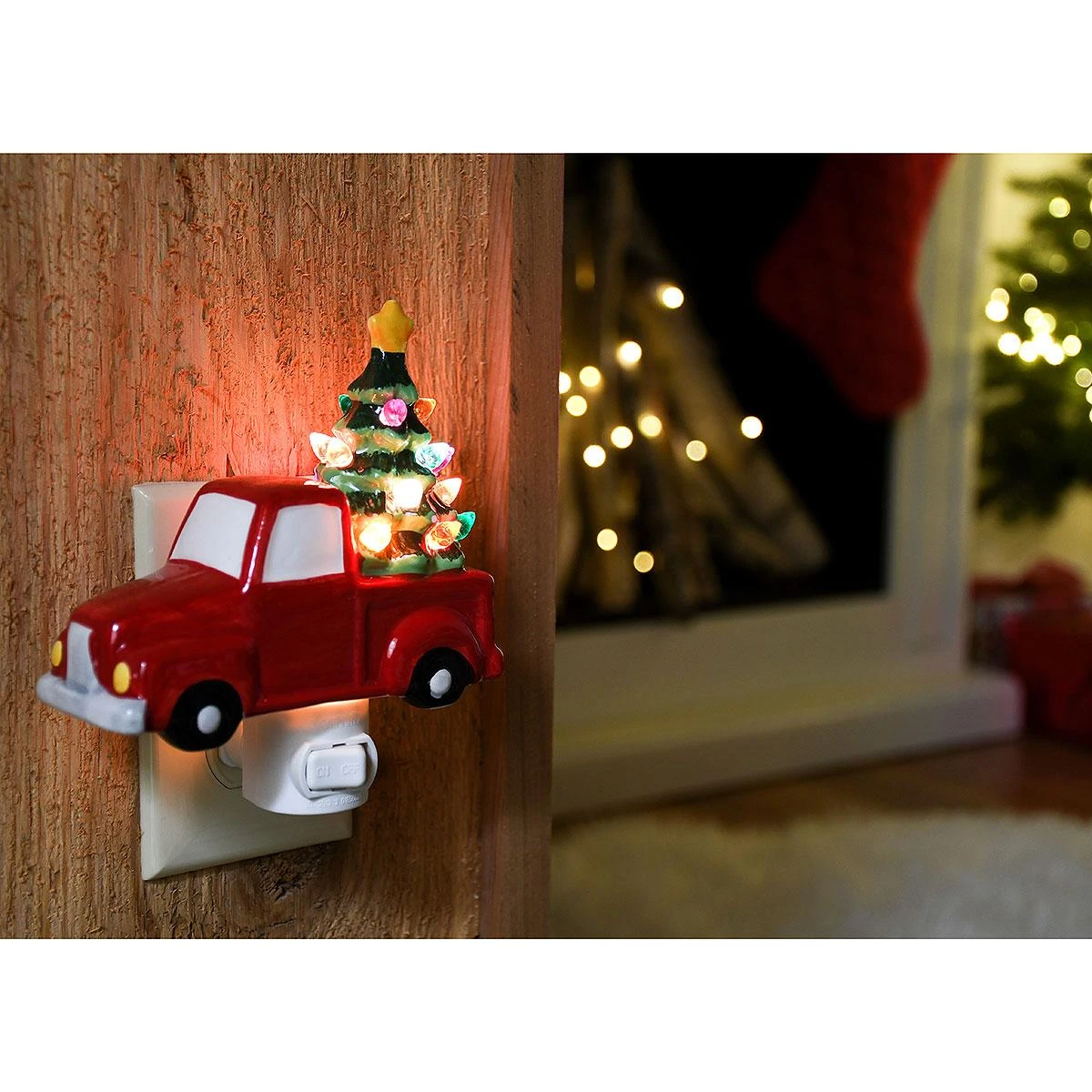 This night light is just “truckin’ along” to keep your evenings merry & BRIGHT with all the vintage vibes! Measuring 5½” tall from base to star, this UL certified® night light features a red pickup truck with a ceramic tree (just like Grandma used to have!) in the bed. Crafted of ceramic, night light features a 360 degree swivel plug-in base with convenient on/off switch.