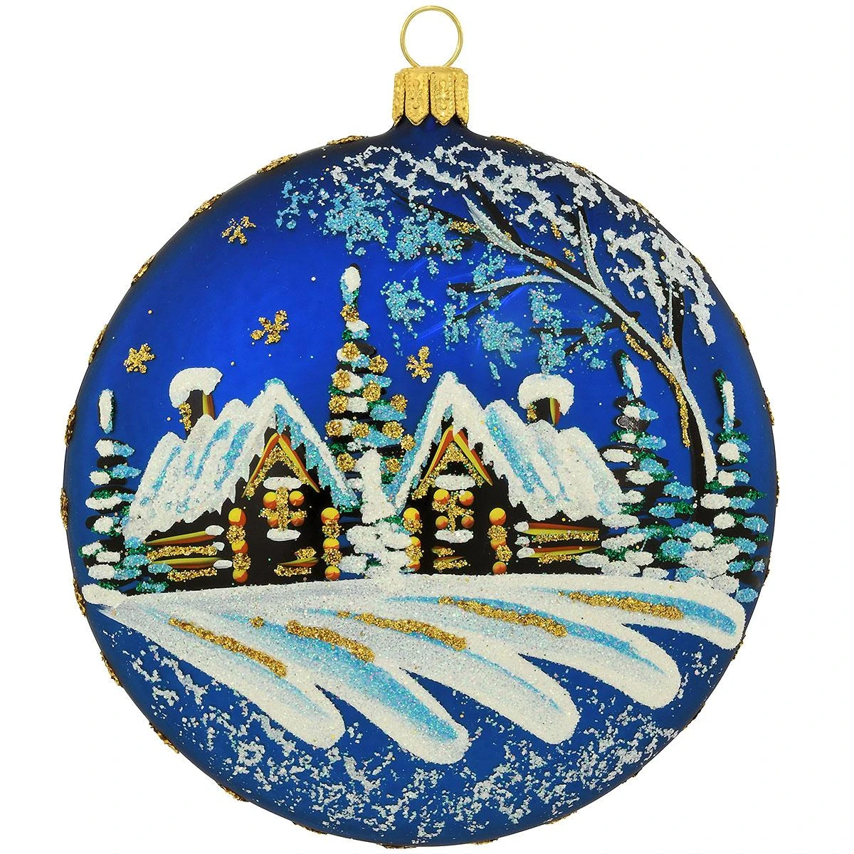 An enchanting snow scene decorates both sides of this beautiful round sapphire blue medallion. 4″ glass ornament depicts two cozy cabins nestled in the woods and shimmers with colorful glitter accents. Handmade in Poland.