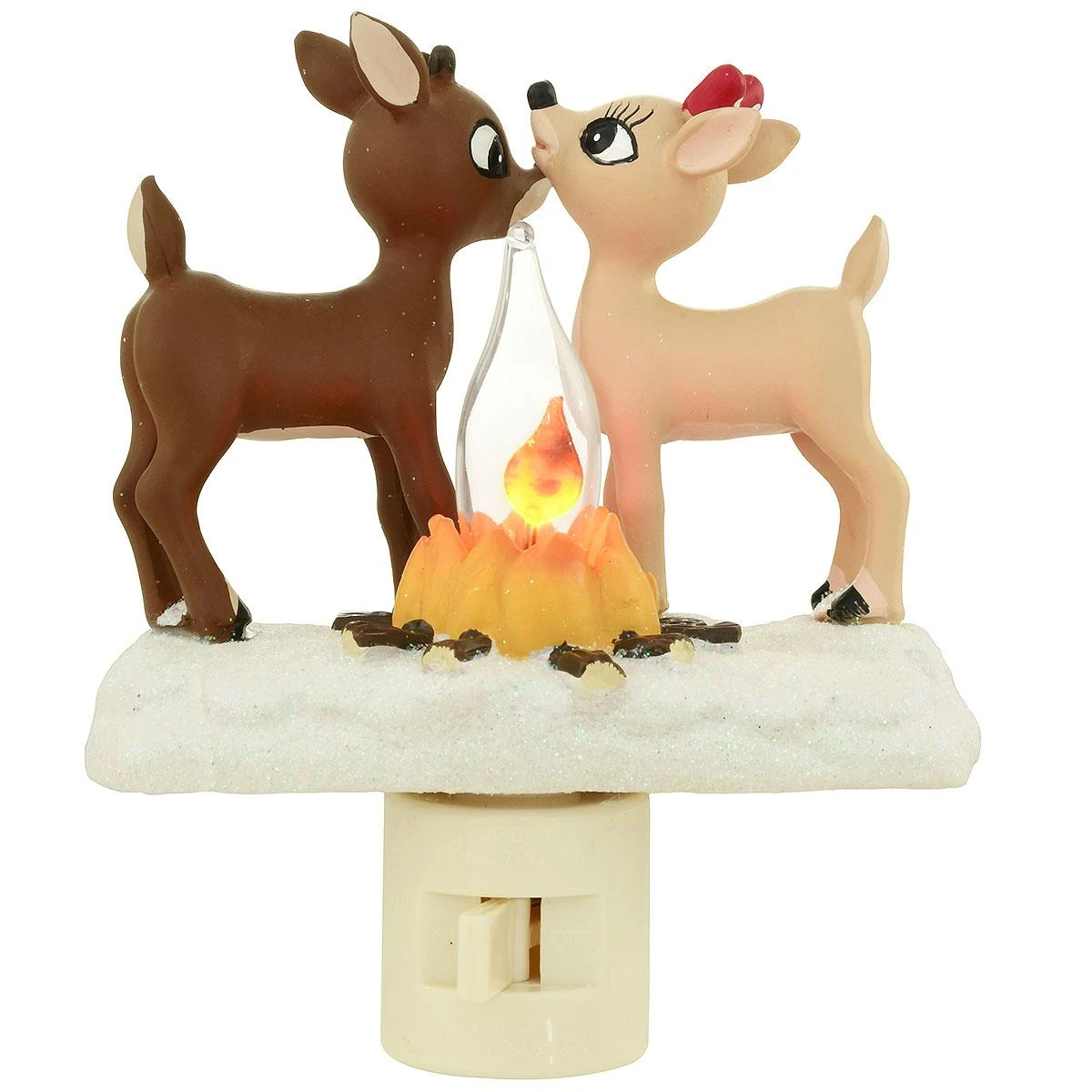 You’ll “deer”-ly love this adorable night light featuring Rudolph and Clarice kissing around a cozy campfire. Crafted of resin with glitter accents, 4¾” night light includes bulb and 360 degree swivel plug-in base with on/off switch. UL listed. Rudolph the Red-Nosed Reindeer©™
