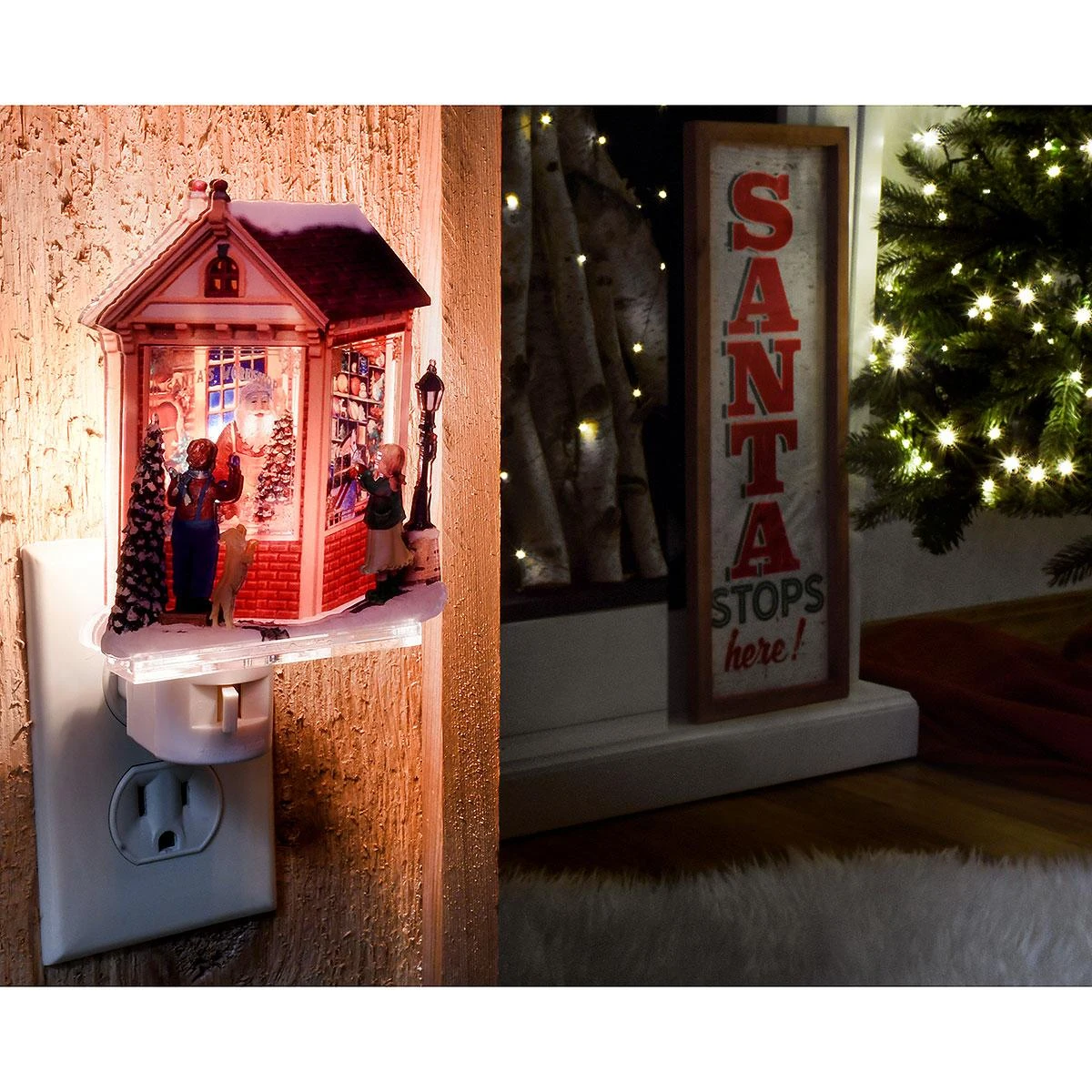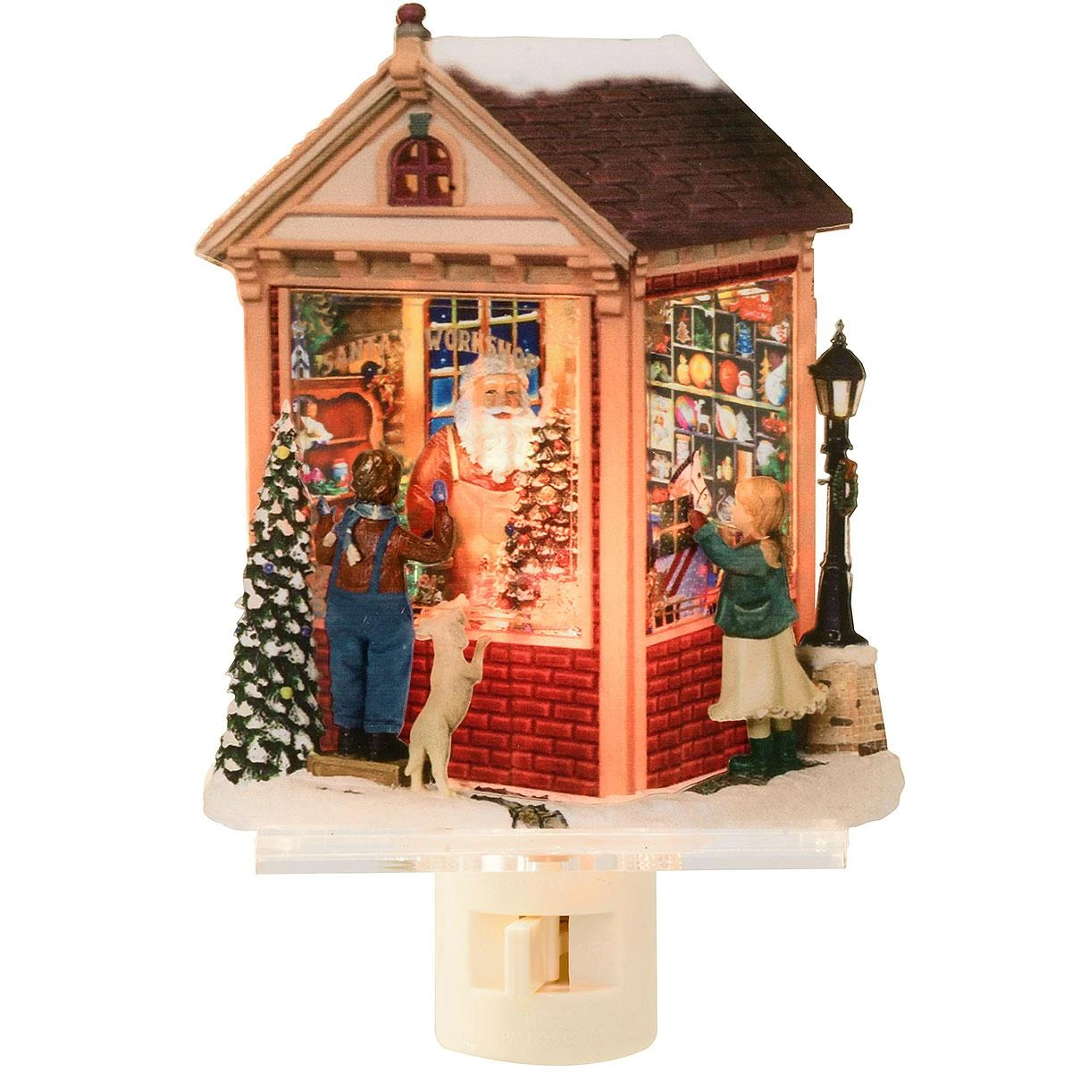 Brighten your nights with this nostalgic North Pole holiday scene! Crafted of acrylic, 5¾” night light depicts two children and their dog peeking in the window of Santa’s workshop filled with toys in an innovative layered design! Nightlight includes C7 bulb and features a swivel plug-in base with a convenient on/off switch to maximize bulb life. UL listed.