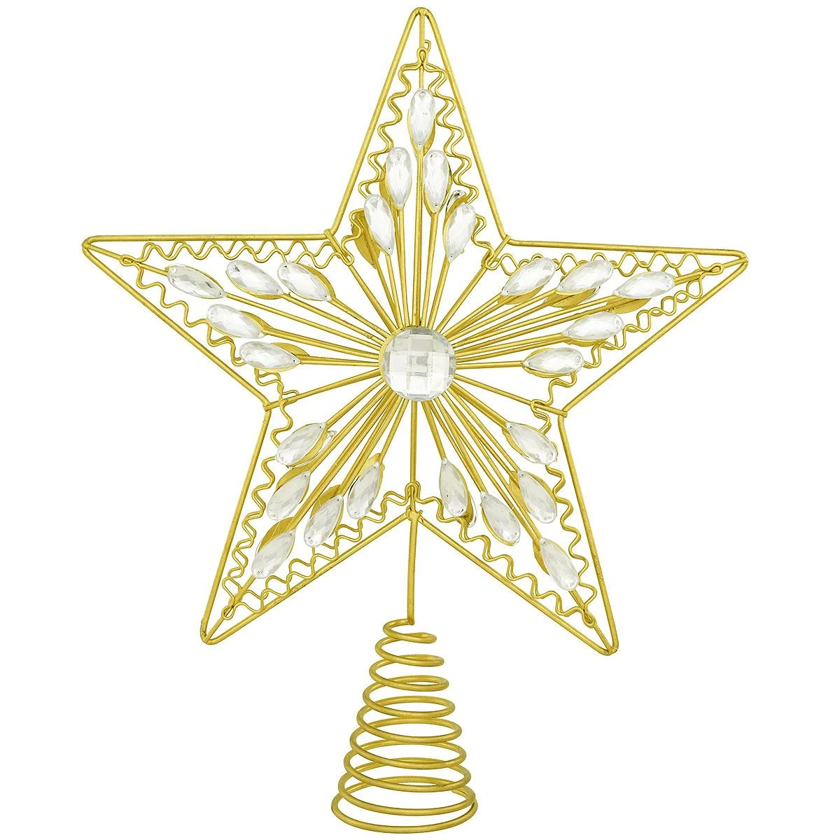 Nothing shimmers like gold and diamonds! Crafted of wire, this shining gold star is adorned on both sides with a myriad of sparkling acrylic teardrop gems. 10½” topper features a traditional coil base for easy mounting.