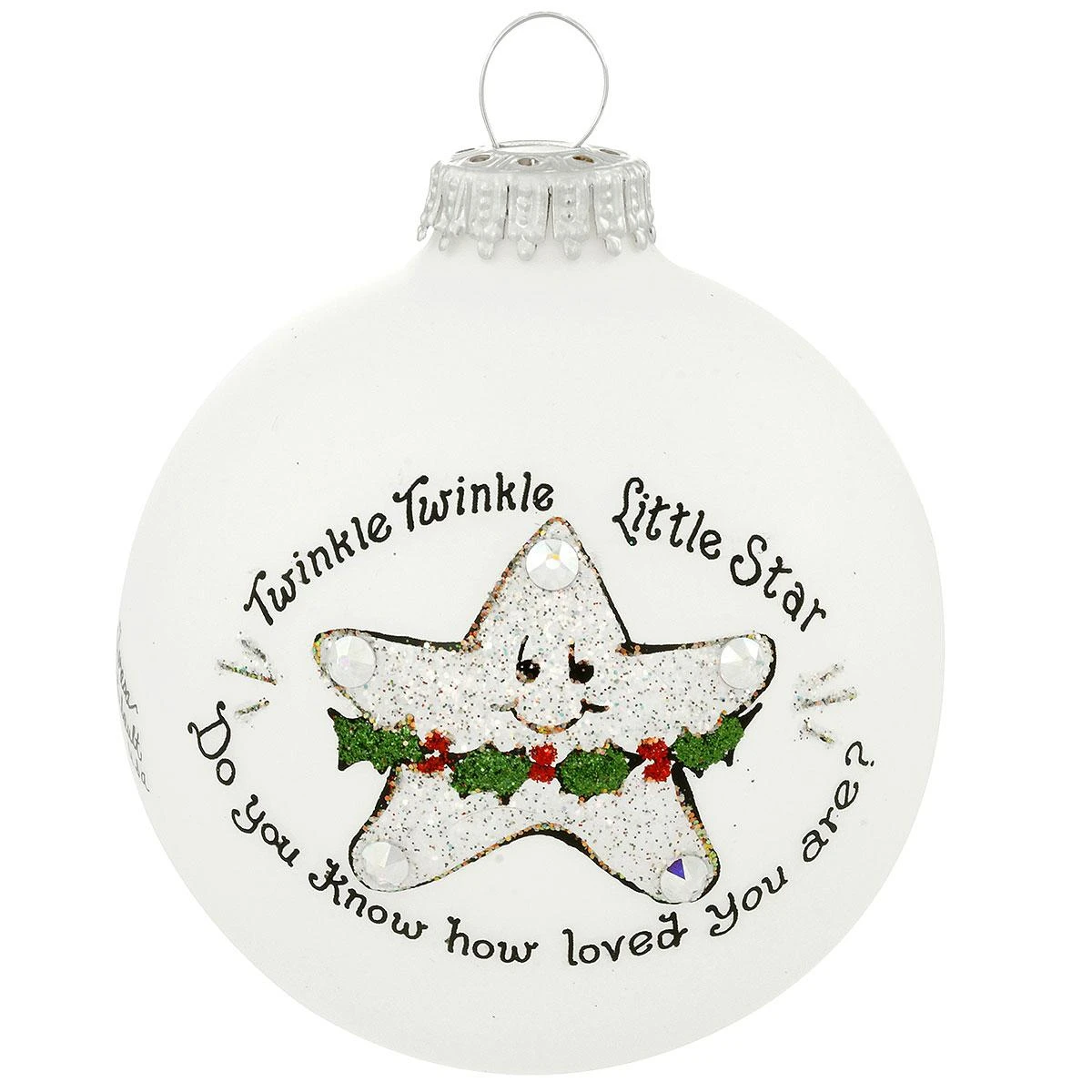 Uniquely crafted with inspired brush strokes and colorful glitter accents, this charming 3ΒΌ” glass ornament makes a wonderful gift for a special friend or family member! Hand-painted from a design inspired by Teresa Thibault, this charming Heart Gifts ornament depicts a smiling star shape adorned with a festive, holly garland and a sprinkling of Swarovski crystals. Proudly made in the USA, this stunning ornament comes attractively packaged for safe storage and easy gift giving. Sentiment reads: Twinkle Twinkle Little Star, Do You Know How Loved You Are?