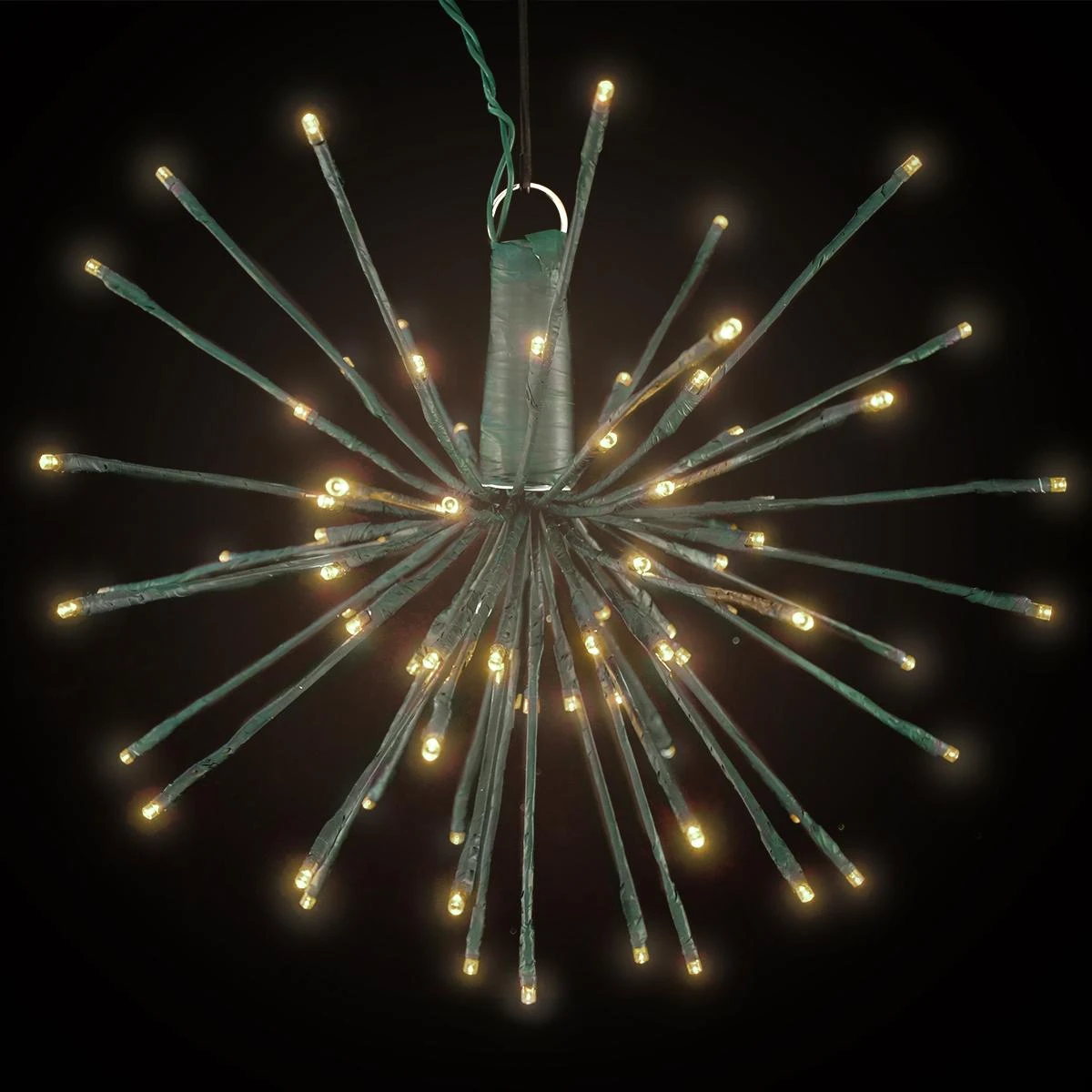There’s nothing cheerier than bright Christmas lights! Our versatile white starburst features a cluster of sturdy wires illuminated with 80 warm white LED lights. Lights can be shaped into an approximate 16″ ball to hang from the ceiling, or shape into a half sphere to decorate a tree, wreath, or wall. Display is wired on an approximate 12″ green cord with 120v raintight plug. Includes 11″ wire hanging hook. UL listed.
