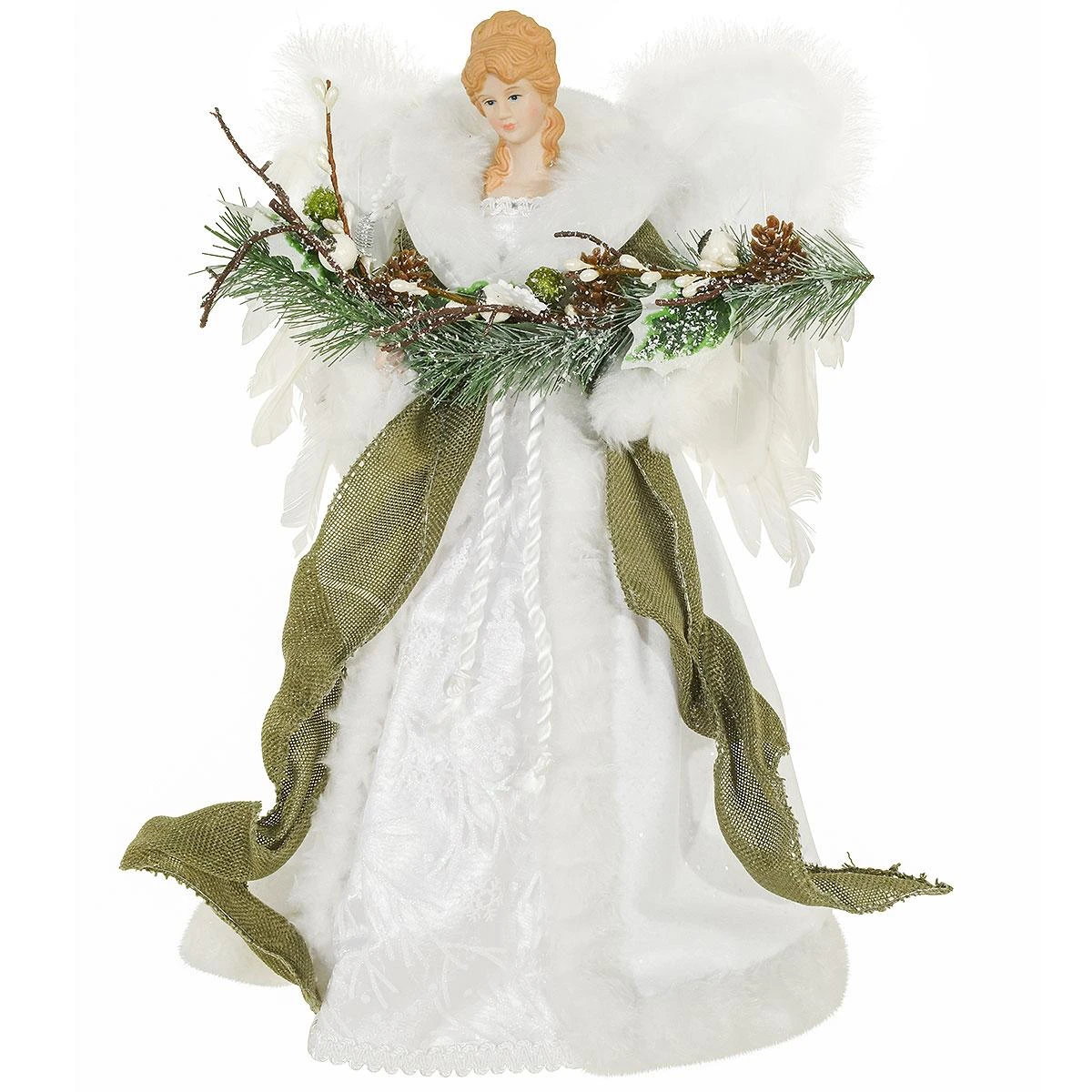 Top your tree with divine inspiration! Our white angel tree topper is adorned with an eye-catching garland of greenery while her snowy white dress is trimmed with fur and a cascading ribbon of sage green. Framing her beautiful hand-painted face are magnificent wings crafted with natural feathers. Tree top measures approximately 17¼” tall.