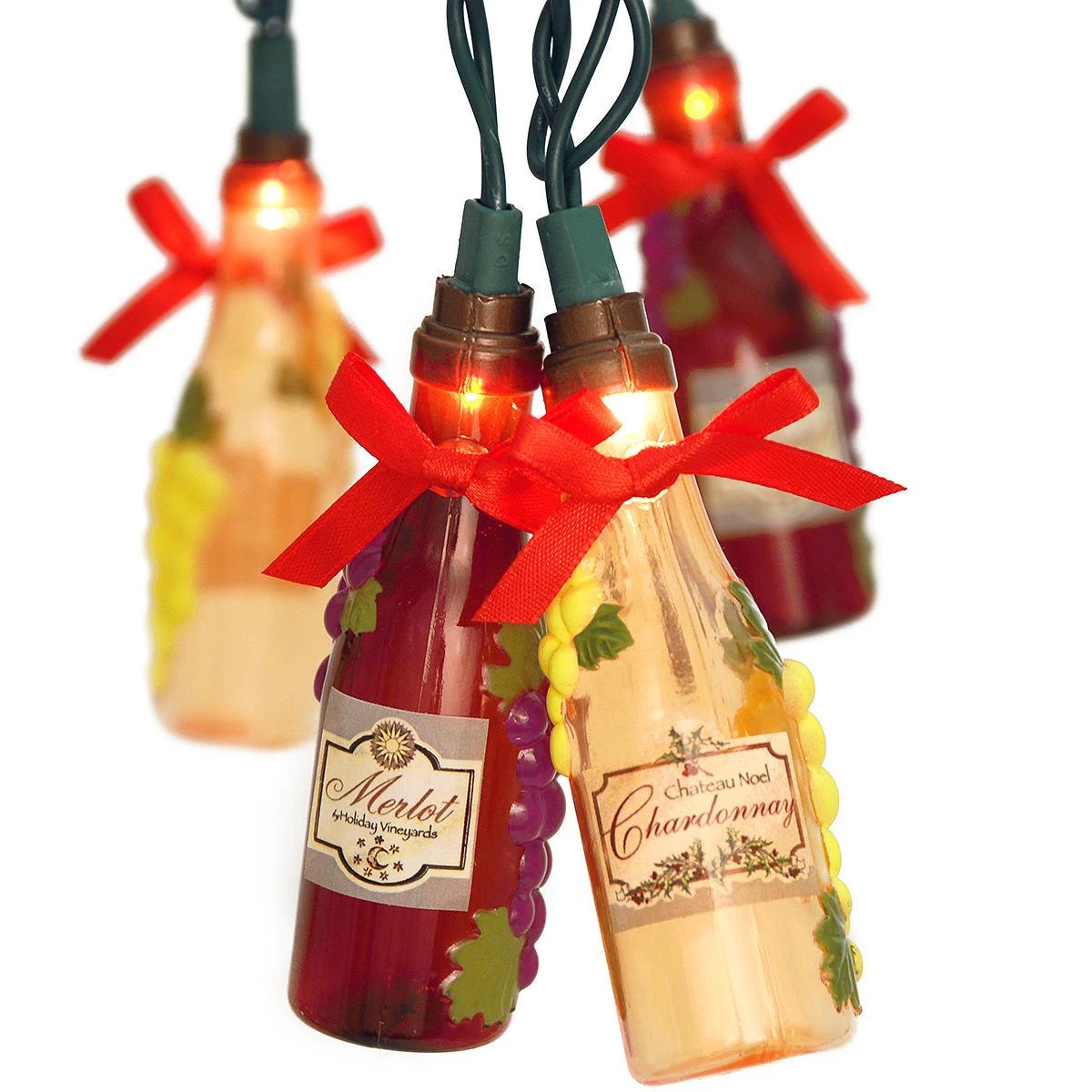 Add a cheerful glow to your indoor or outdoor space with this taste-ful wine-themed light set! Featuring amber and purple Chardonnay and Merlot bottles accented with clusters of grapes, red bows, and decorative holiday labels, this 10 light set includes: